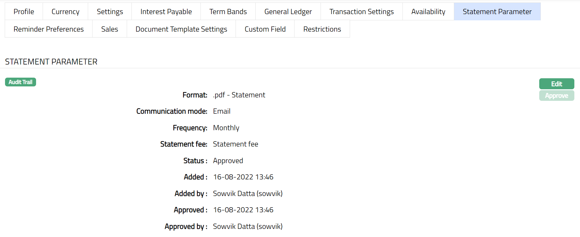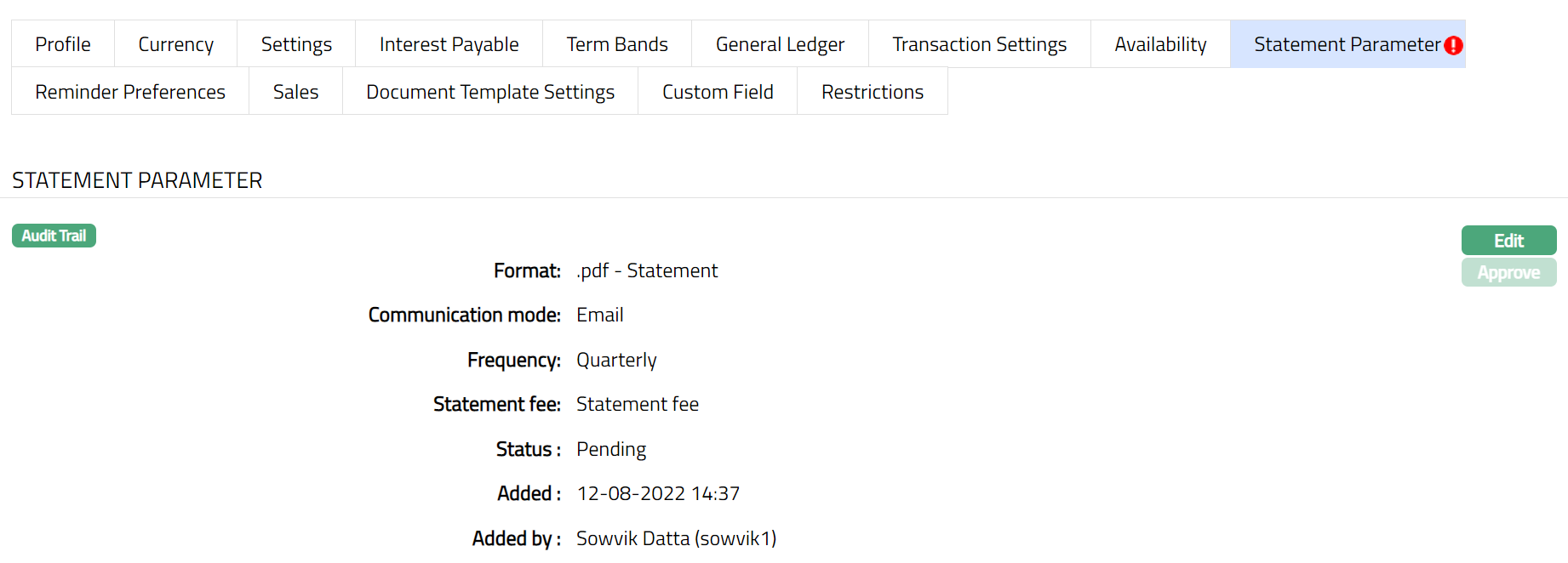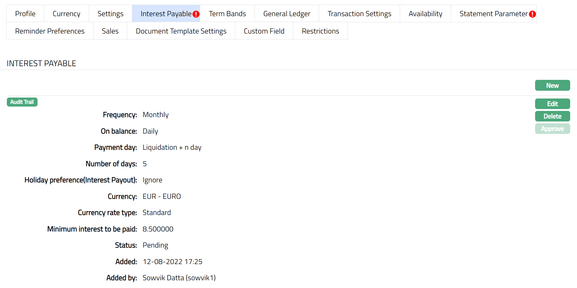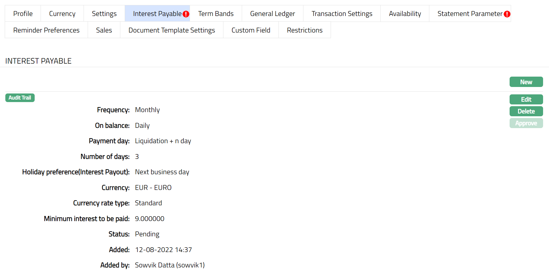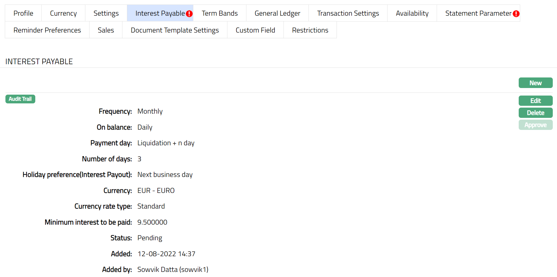 After creation / edit, the tab is in Pending status. To approve, retrieve the record and Click Approve. Once the tab is approved, no further changes can be done on the Interest Payable tab. If you want to change any settings for the Product under the Interest payable tab, you have to use the New button.