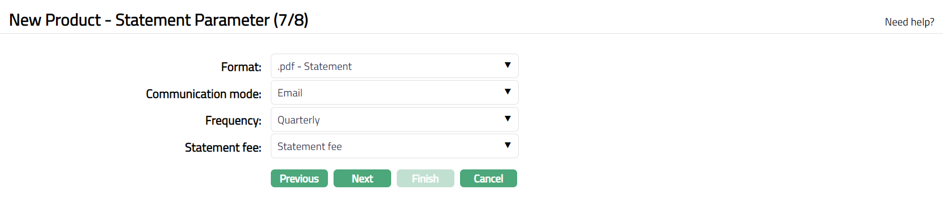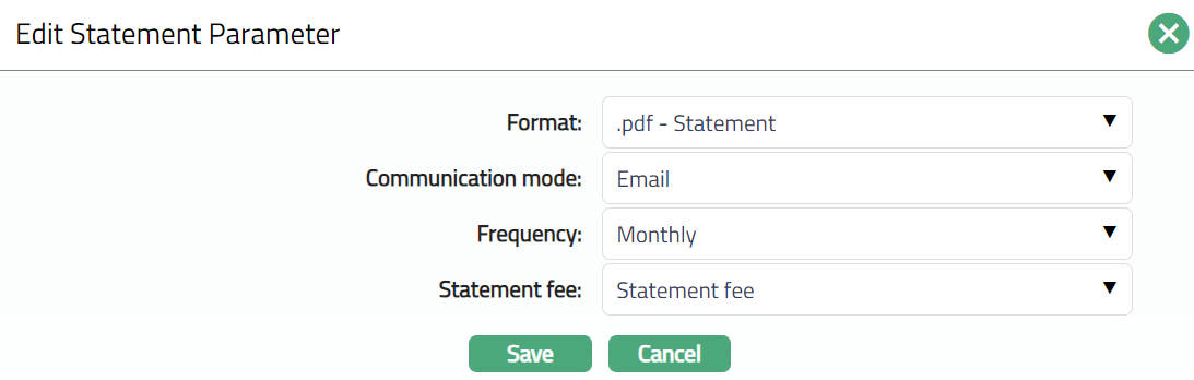 Select Communication mode from the drop-down list -- i.e., the manner in which you want to send the statement. Available options are Data handoff, e-invoice, e-mail, paper, SMS and Web Hotel.