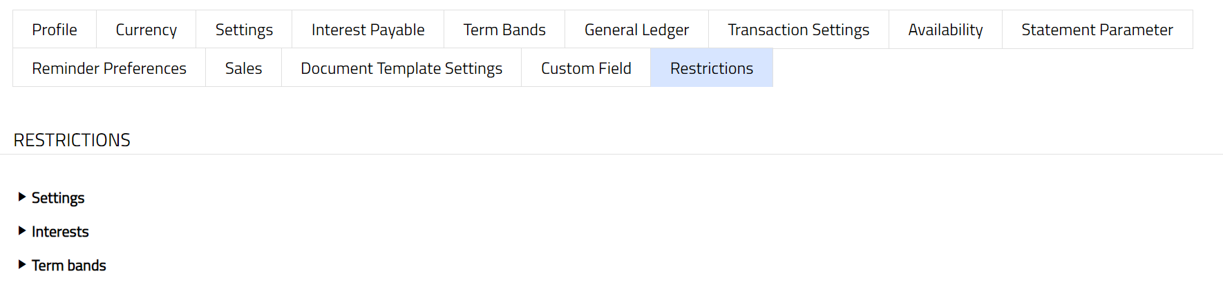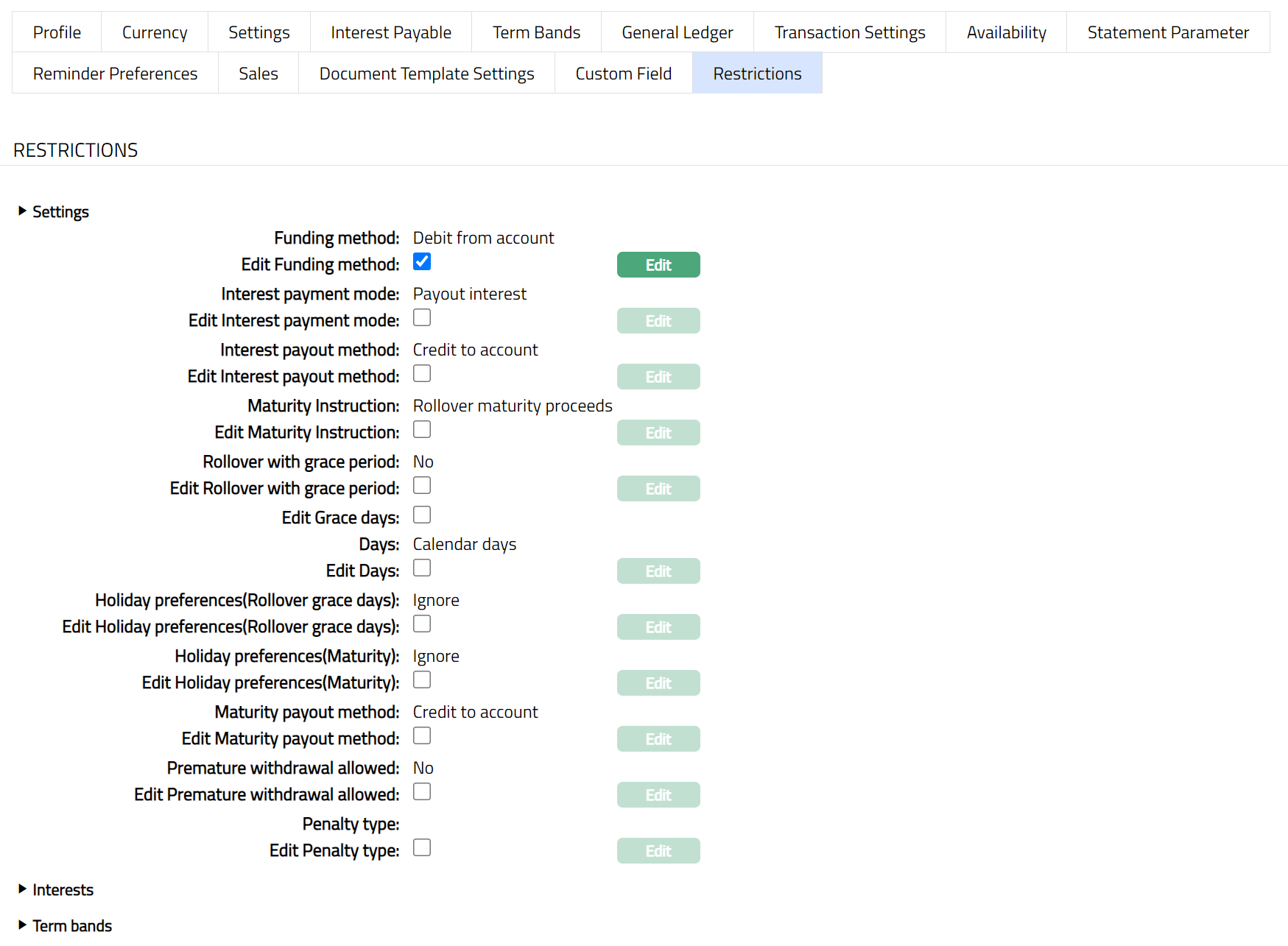 Note: Similarly, you can do necessary changes by selecting the required restriction for Interest Payable under Interests and Term Bands.