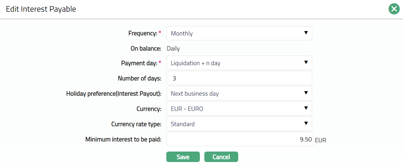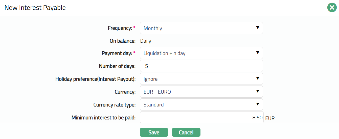 Payout Interest: If it is simple interest to be paid out and not to be compounded, select Payout Interest. In this case interest will be paid into the Client account based on Interest liquidation frequency.