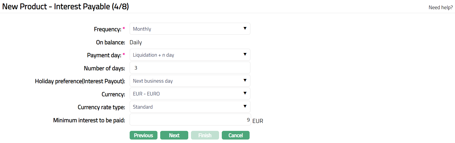 Click Next. The New product -- Interest Payable (4/8) page appears.