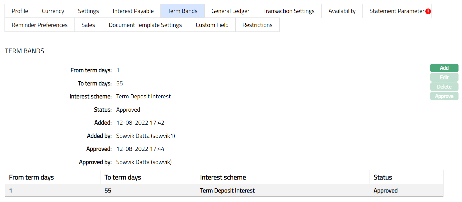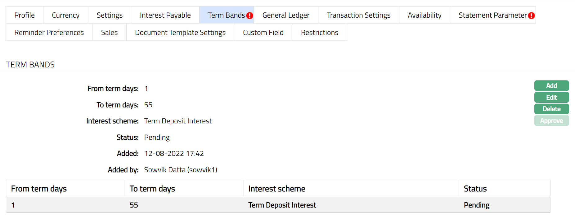 Note: After creation / edit, the tab is in Pending status. To approve, retrieve the record and Click Approve. Once the tab is approved, no further changes can be done on the Term Bands tab. If you want to change any settings for the Product under the Term Bands tab, you have to use the Add button.