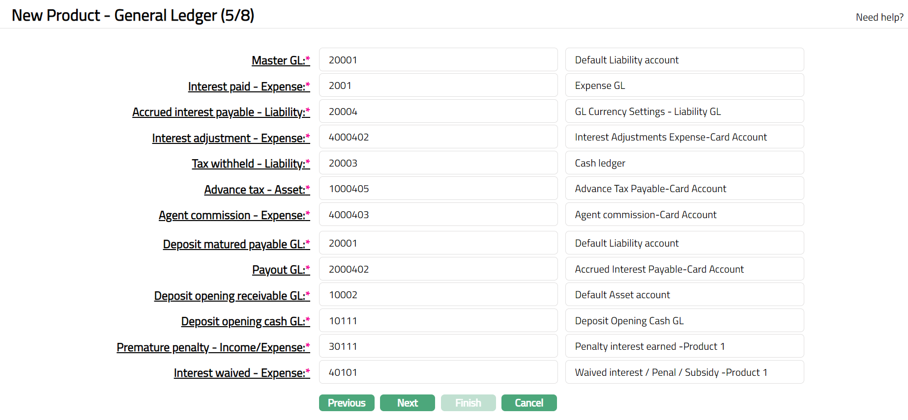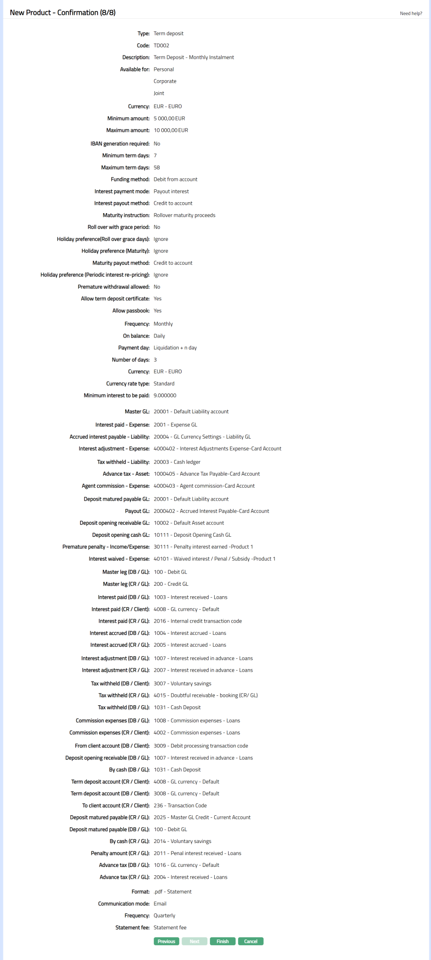 Access Product page. Click General Ledger tab to view the details as per sample below. The details are defaulted from the entries that you made during Product creation. For details refer to Term Deposit > New Product -- General Ledger (5/8).