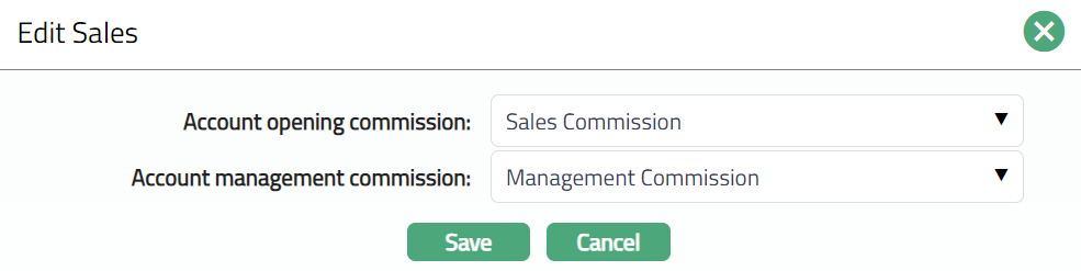 If you want to allow a specific commission for account opening, select the Account opening commission from the drop-down list of active Charges maintained under Admin > Pricing > Charges > Charge Schemes, where the Charge type is Event, Flat and Treat as Commission is Yes.