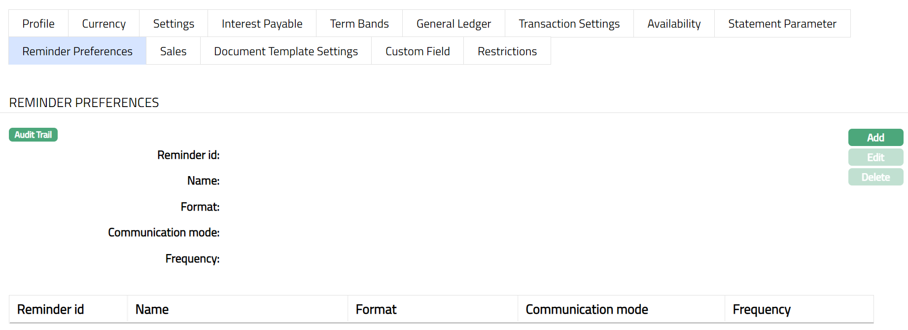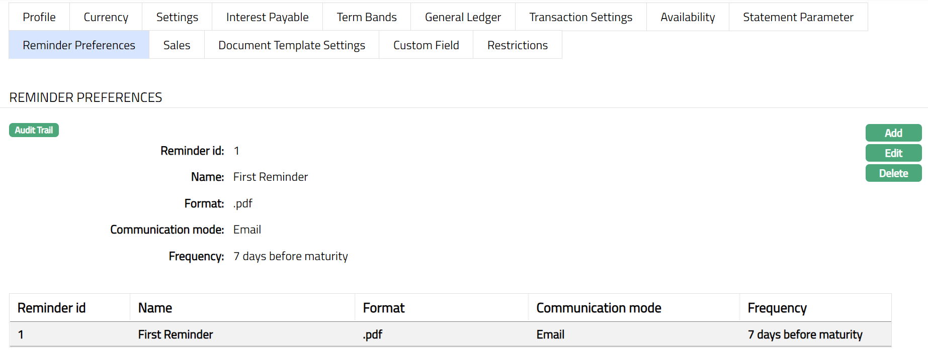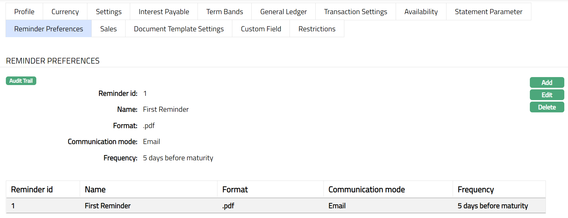 The Reminder preferences tab allows you to add, view and edit the preferences based on which the reminders are sent to client for recovering their dues.