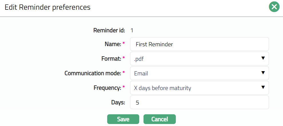 Select Format from the drop-down list of reminder formats that have been maintained under Admin > System codes > Generic definition > Reminder formats. It is the Format of the reminder that is to be generated.
