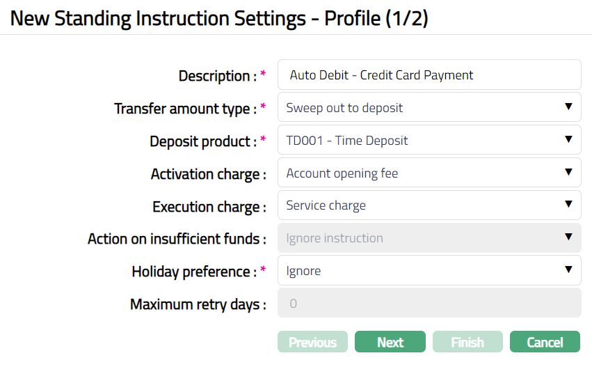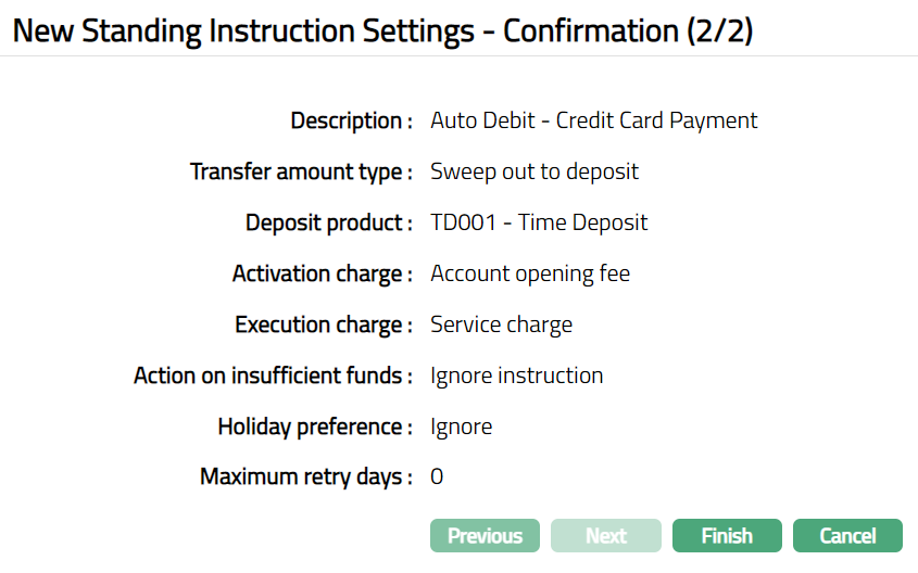 - Click Finish. Standing Instruction Settings page appears with all the details you have added, showing Profile tab by default. The status of the Standing Instruction Setting will be Active as soon as it is created.