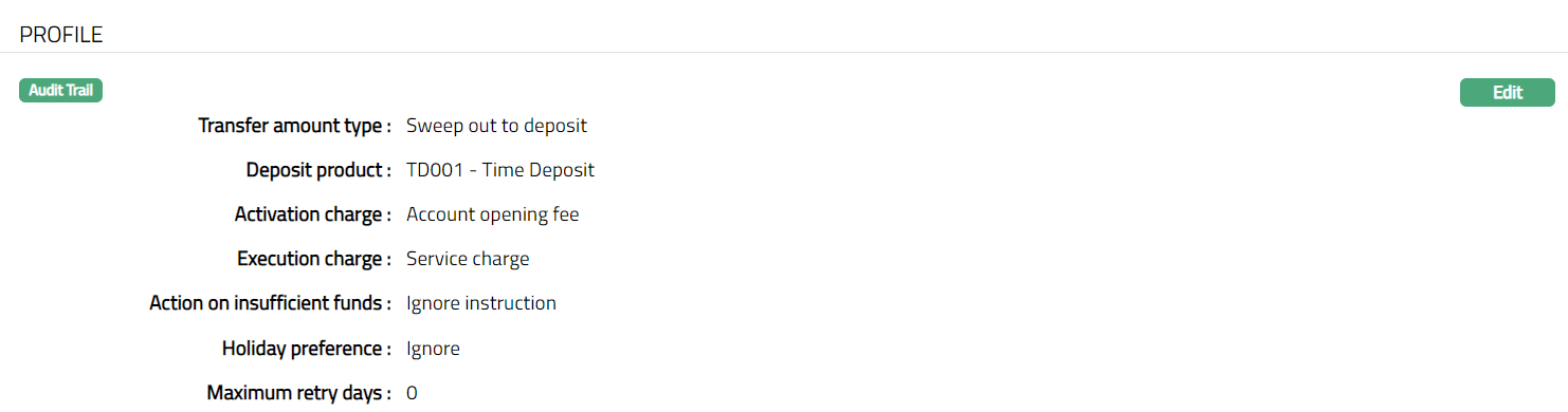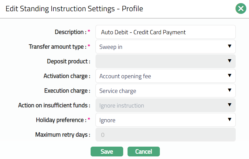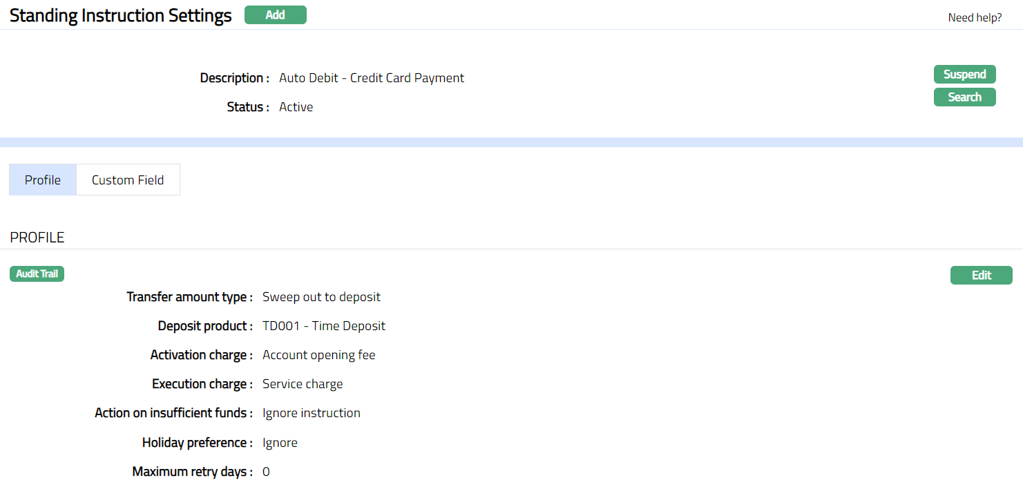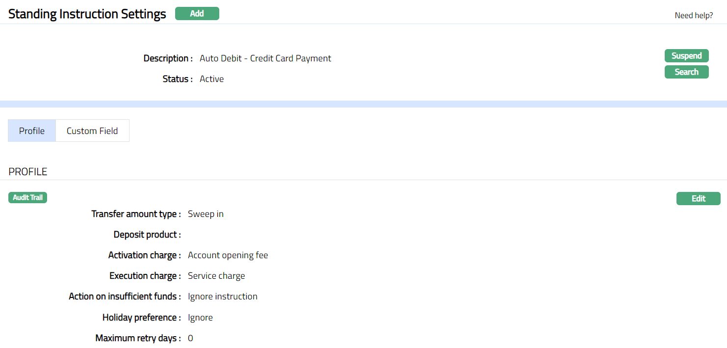 Profile tab, which is the default tab in Standing Instruction Settings page screen, shows the basic details of the Standing Instruction Setting.