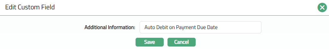 Enter Additional Information for the custom field as applicable. For Example: any additional information in relevance to the standing instruction settings can be updated.