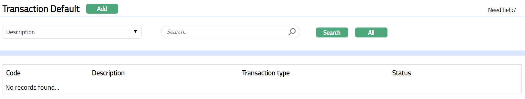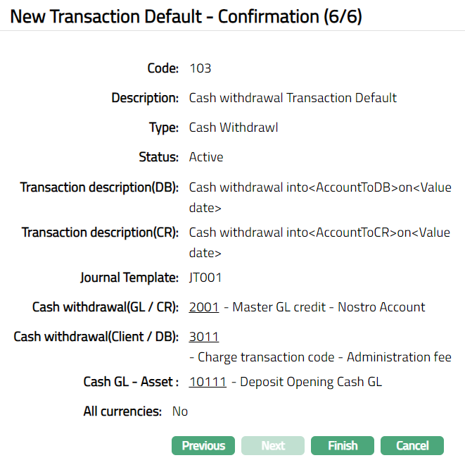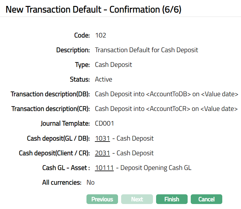 - Click Finish. Transaction Default page appears with the added details. Note: Status of the record is Active.