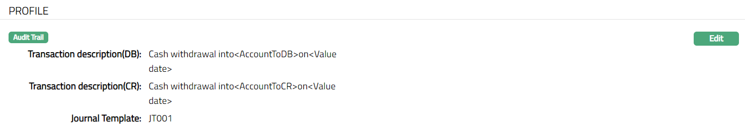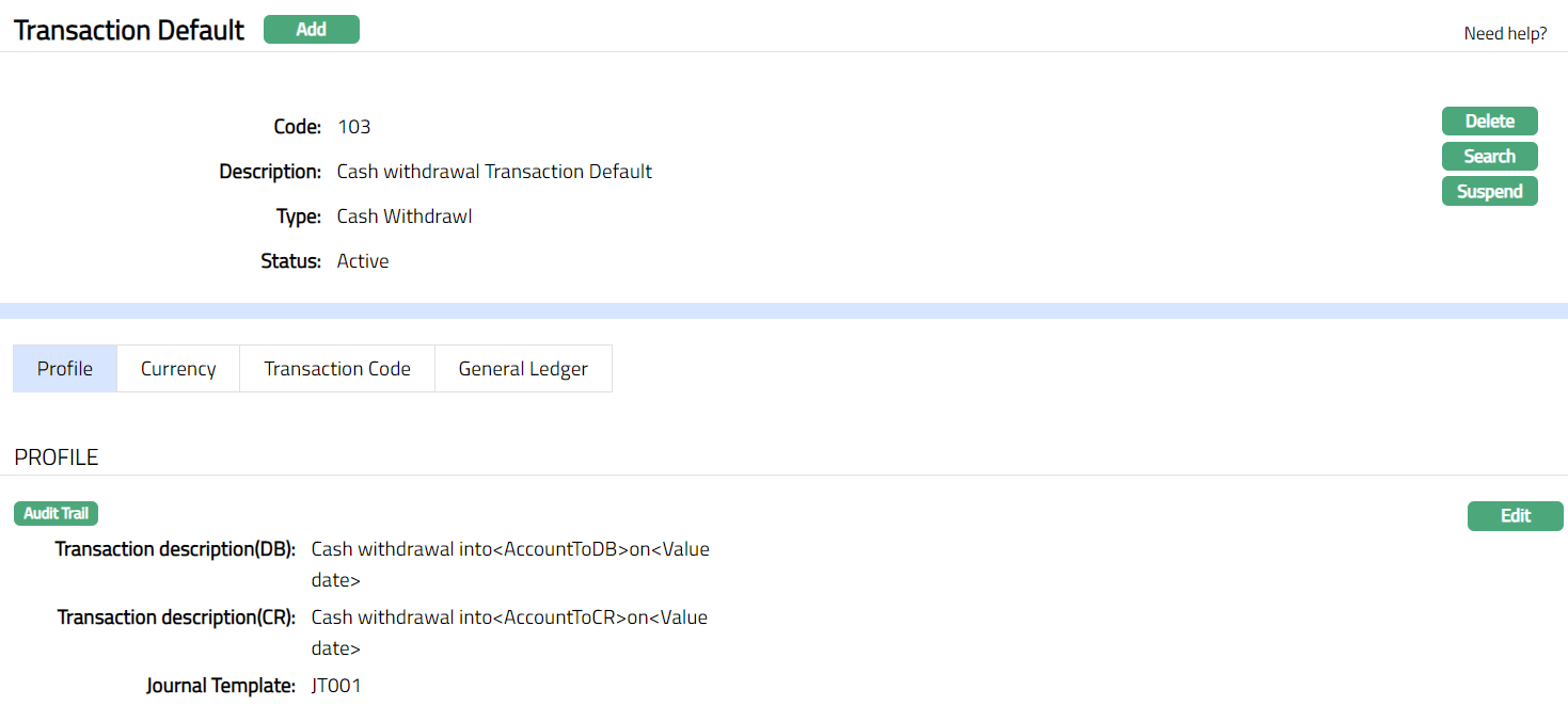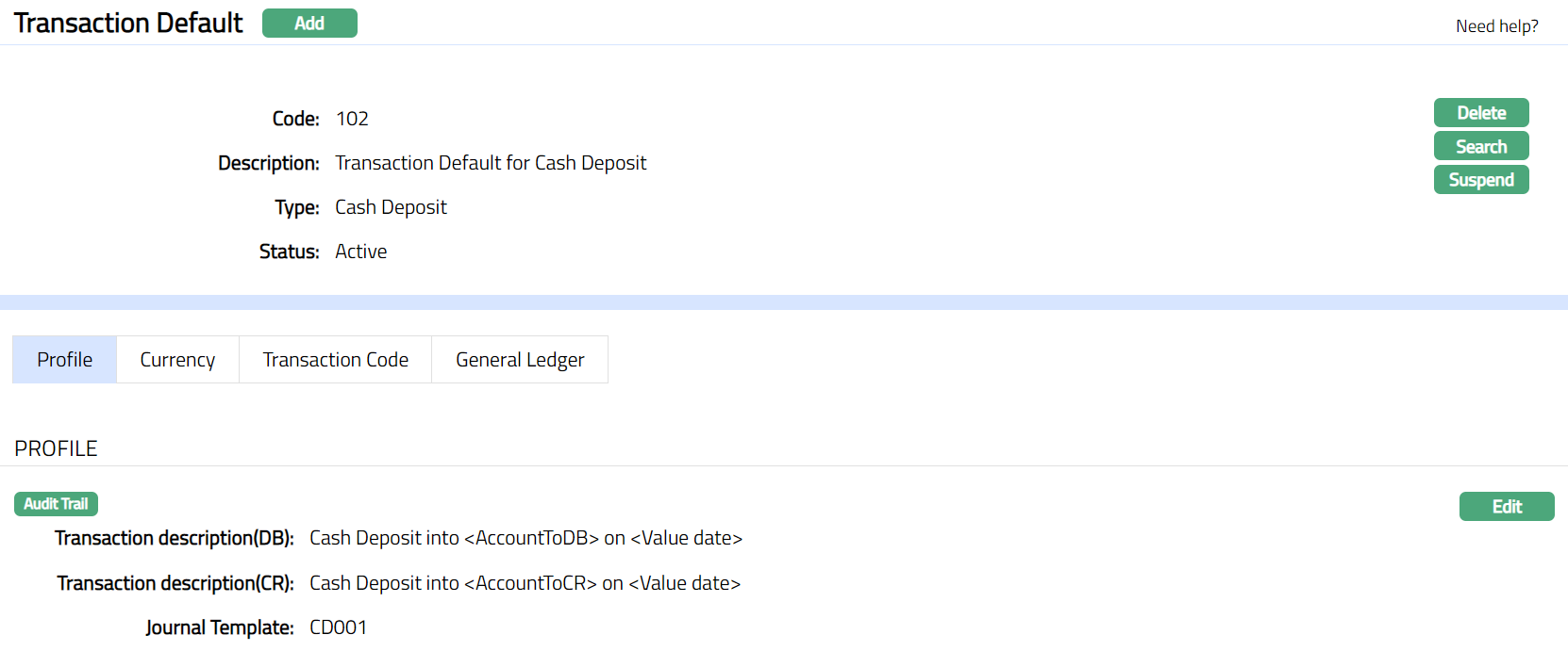 - Access Transaction Default page and click Profile tab to view the details as per sample below. The details are defaulted from the entries that you made during creation of a Transaction Default. For details refer to New Transaction Default -- General (1/5)
