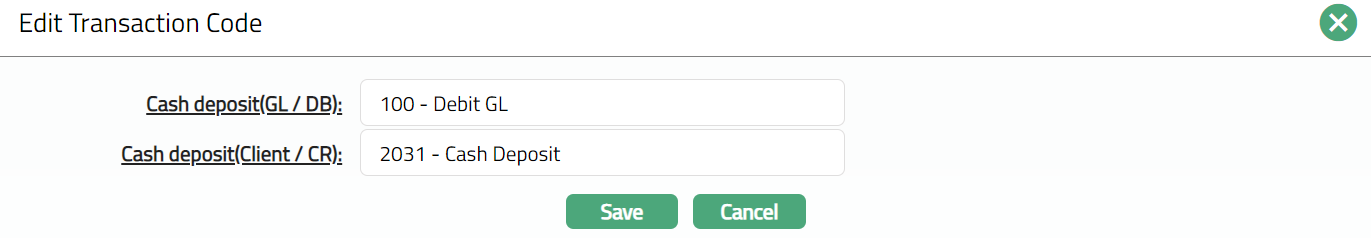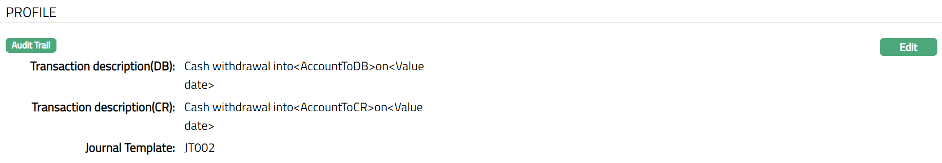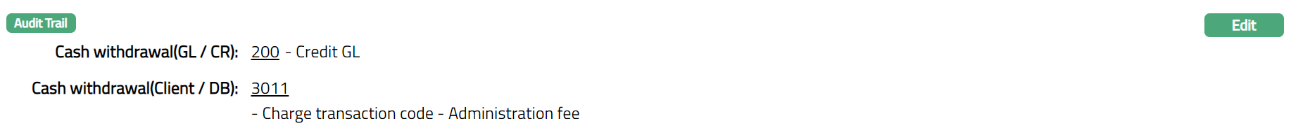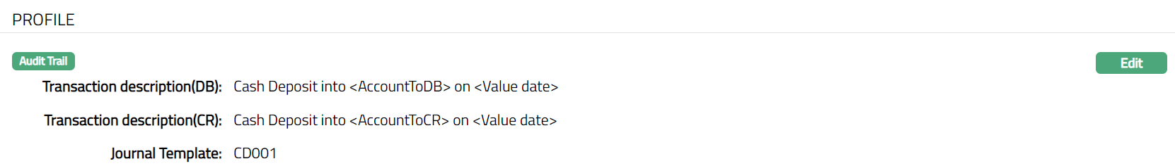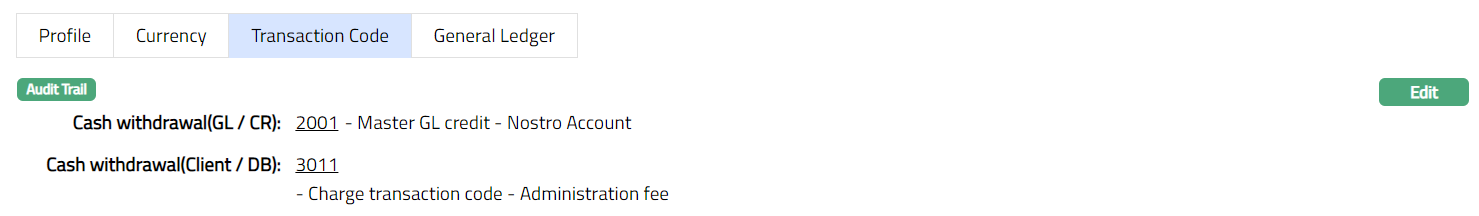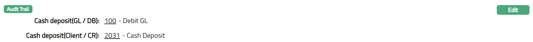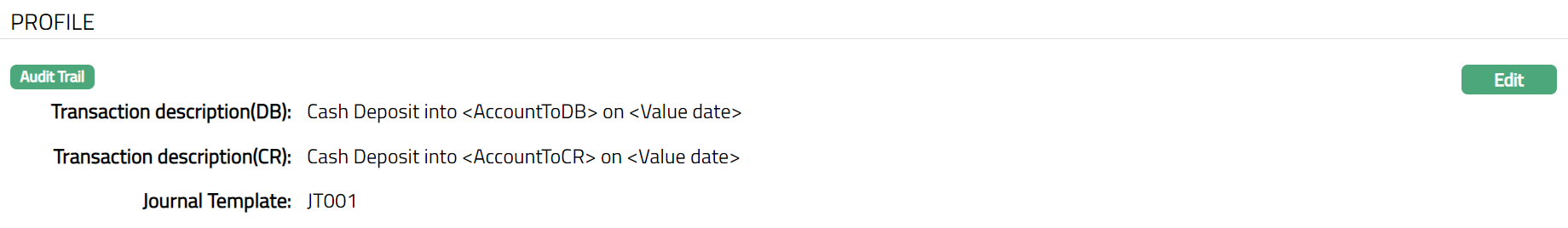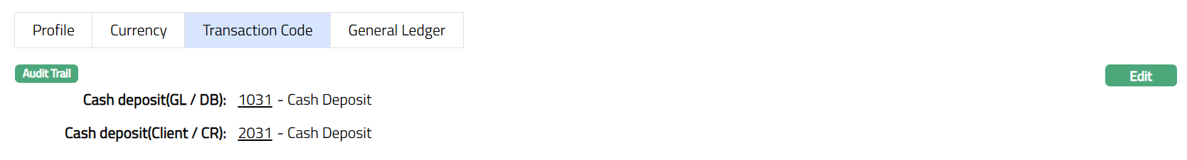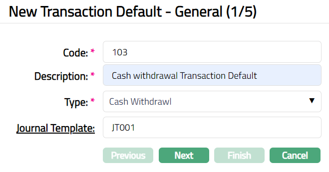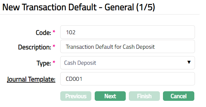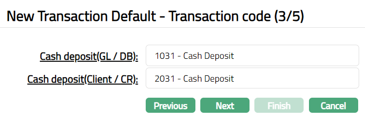 Following are the tabs that appear on creation of Transaction default for both Cash Deposit and Cash Withdrawal types.