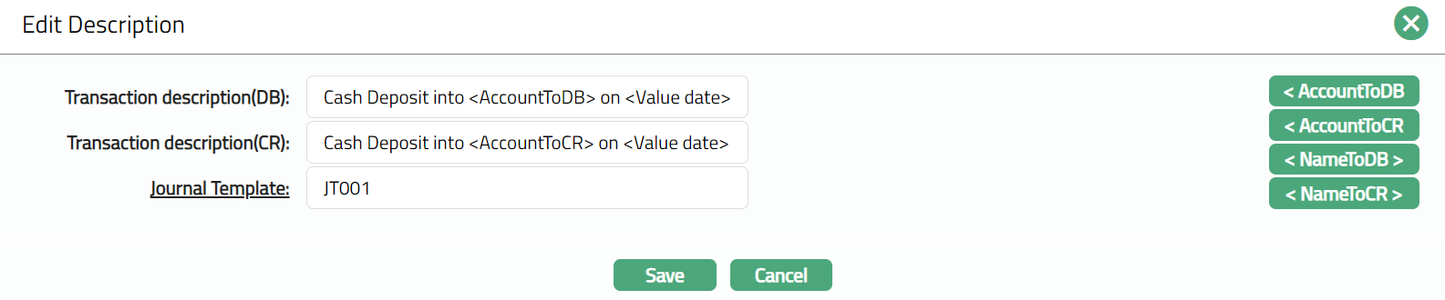 - Enter Transaction description (DB) details for the debit entry. You can include specific details of the transaction in the description using the buttons on the right. Click on the required button to include it in the description. The available codes are as follows: