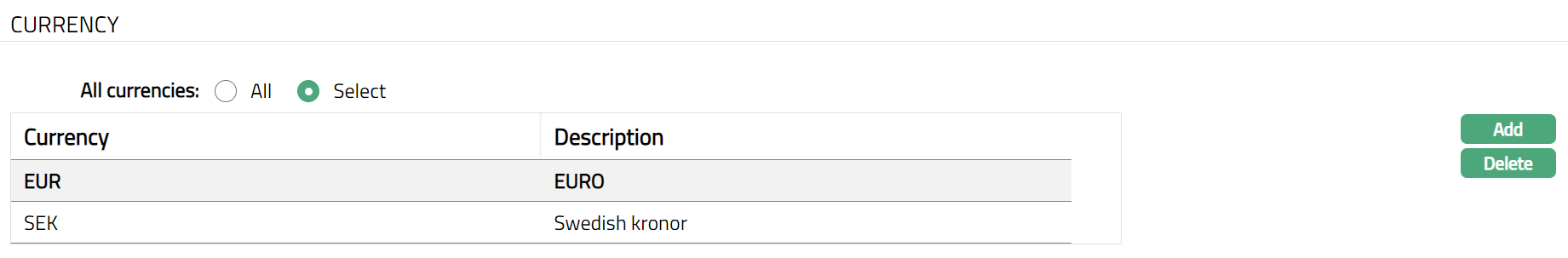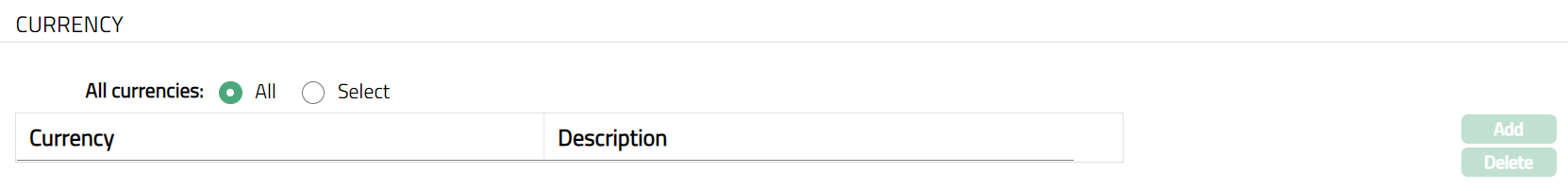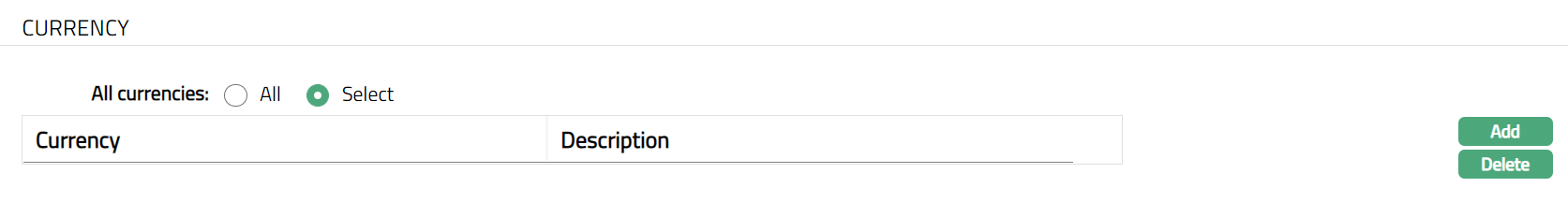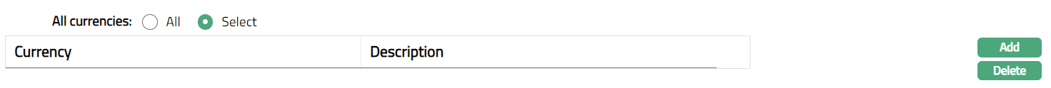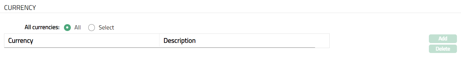 To restrict the currencies for which this Transaction default is available, click Select radio button. Add button will be enabled.