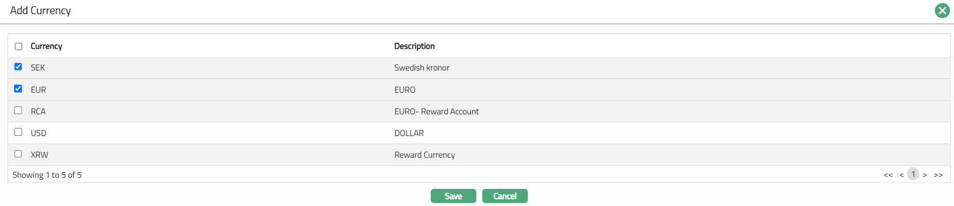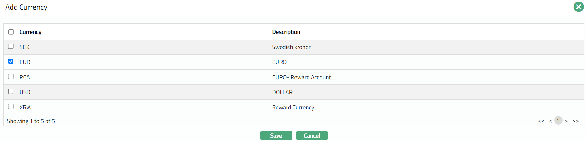 - Click Add. Add Currency screen appears where you can select the required currency from the list of all active currencies.