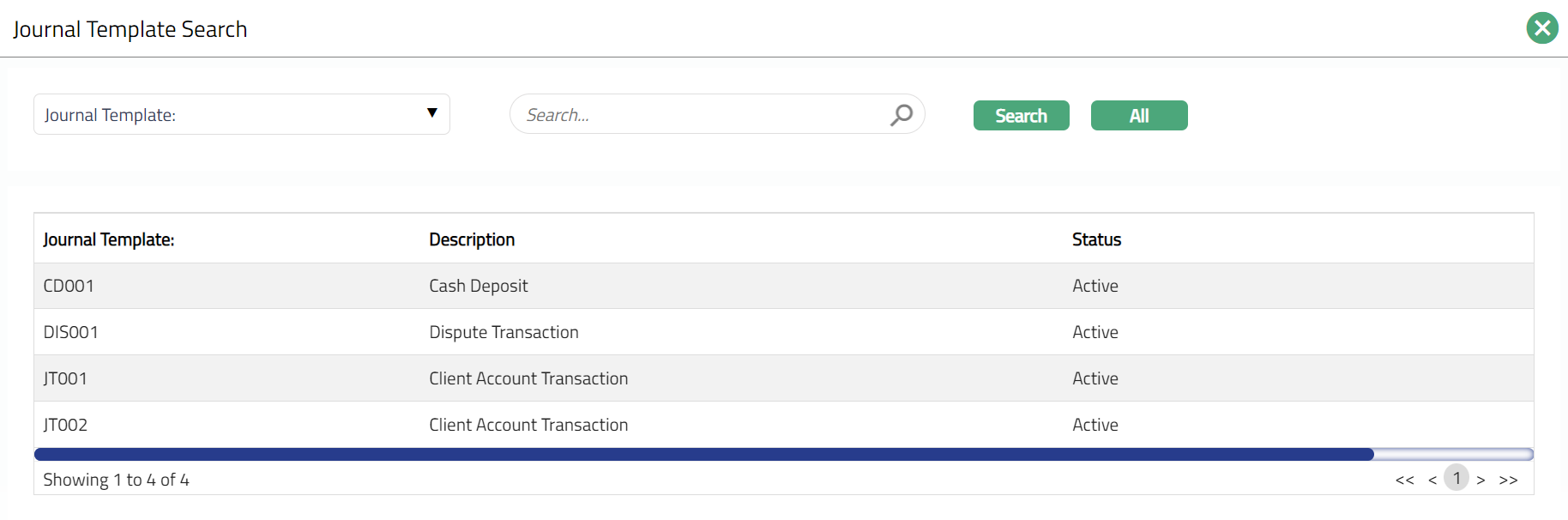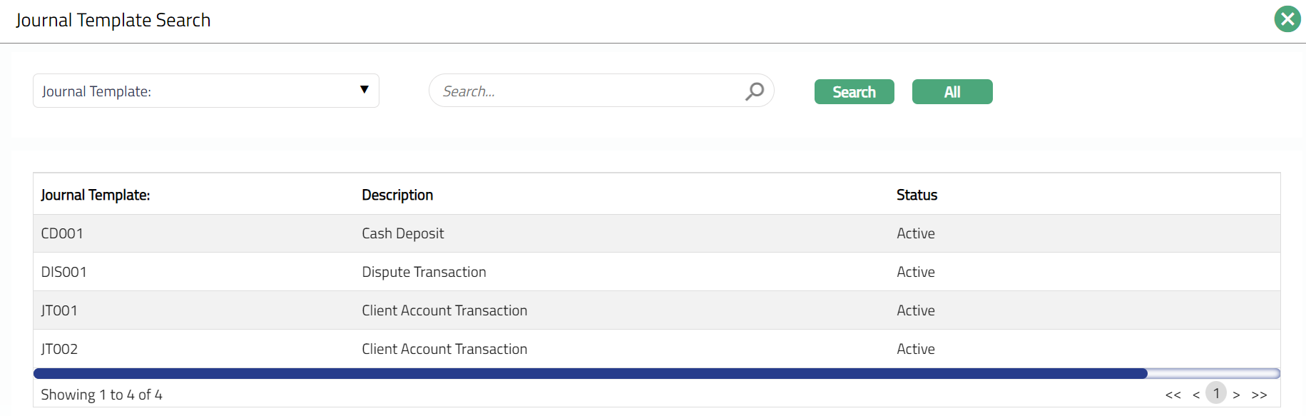 Input which Journal Template is to be used for the accounting entries to be posted on input of transactions under the chosen Type. Click the hyperlink Journal Template. Journal Template Search** Screen appears with the list of all active Journal Templates. Select the required Journal Template from the list.