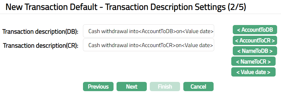 - Click Next. New Transaction Default -- Transaction Description Settings (2/5) page appears.