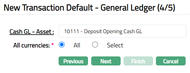 Click Next. New Transaction Default - General Ledger (4/5) page appears. If you choose Select option for All currencies field, then the New Transaction Default -- General Ledger (4/5) changes to New Transaction Default -- General Ledger (4/6).