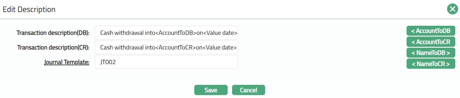 - Enter Transaction description (DB) details for the debit entry. You can include specific details of the transaction in the description using the buttons on the right. Click the required button to include it in the description. The available codes are as follows: