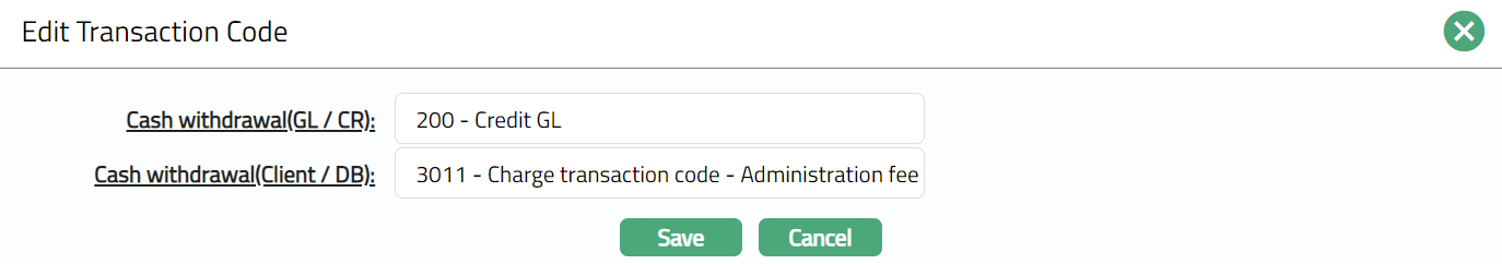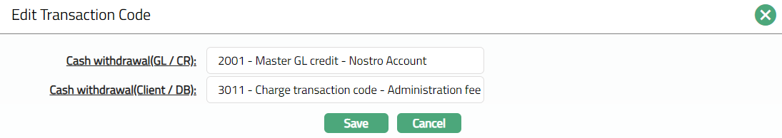 Click the hyperlink Cash withdrawal (Client/DB). This is the transaction code that will be used for the debit leg of the accounting entry for the Cash withdrawal. If you click on the hyperlink, the Transaction Search Code appears with the list of active Client account debit transaction codes, which must be maintained under General Ledger > Settings > Transaction codes.