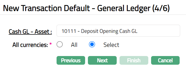 Click Next. New Transaction Default-General Ledger (4/5) page appears. Note: If you choose Select option for All currencies field, then New Transaction Default -- General Ledger (4/5) changes to New Transaction Default -- General Ledger (4/6). Sample screen shot shown below when select radio button is selected.