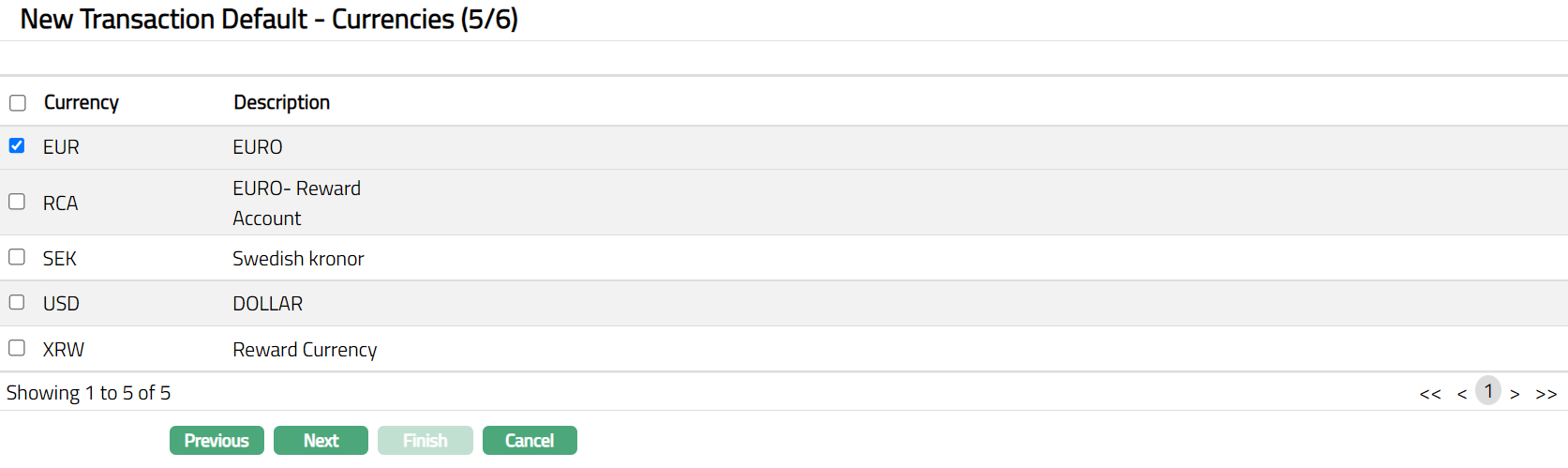 Click Next. New Transaction Default-Currencies (5/6) page appears.