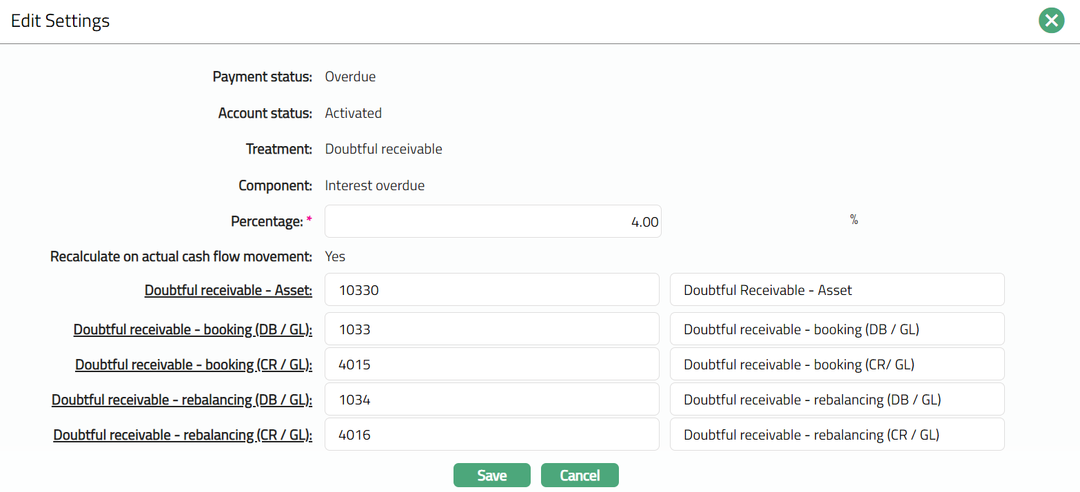 Payment Status, Account status, Treatment, Component and Recalculate on actual cash flow movement fields are not editable. The percentage and Accounting-related fields (i.e., General Ledger and Transaction Settings) are editable.