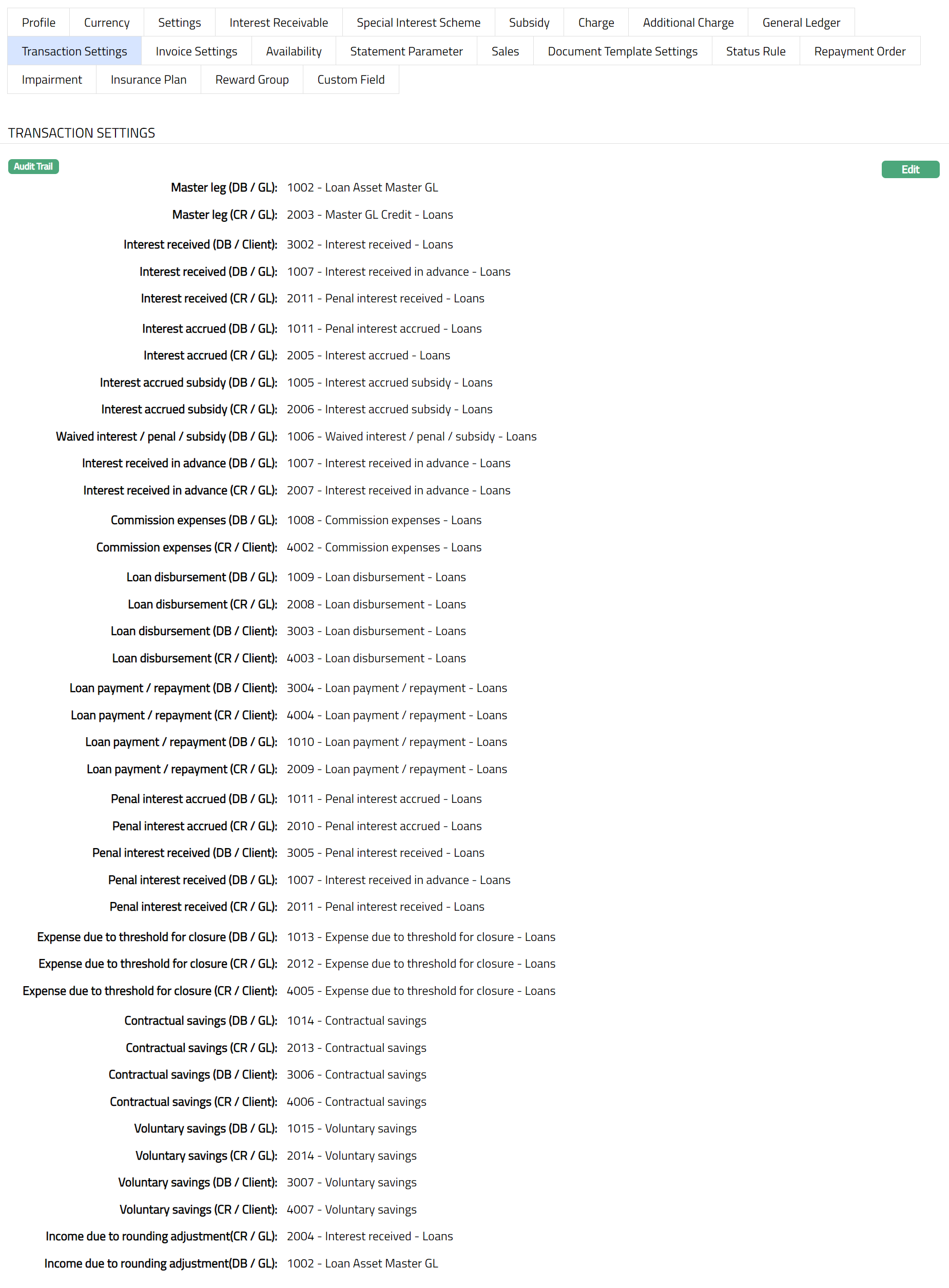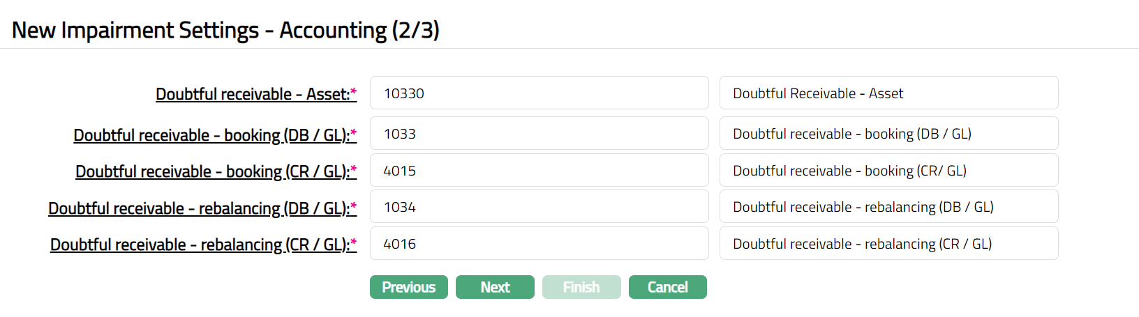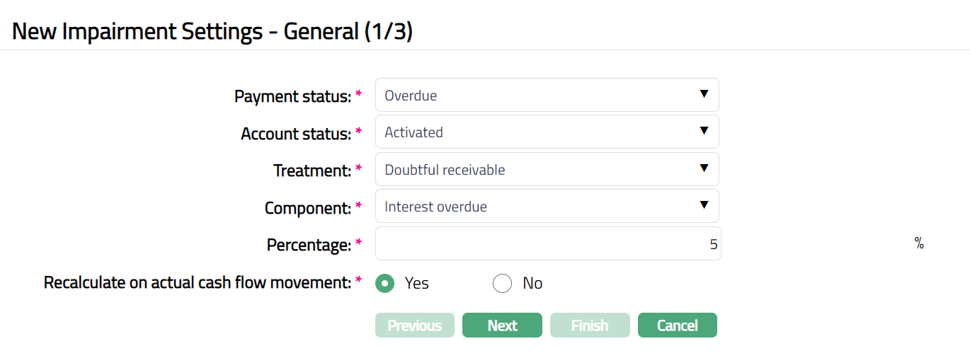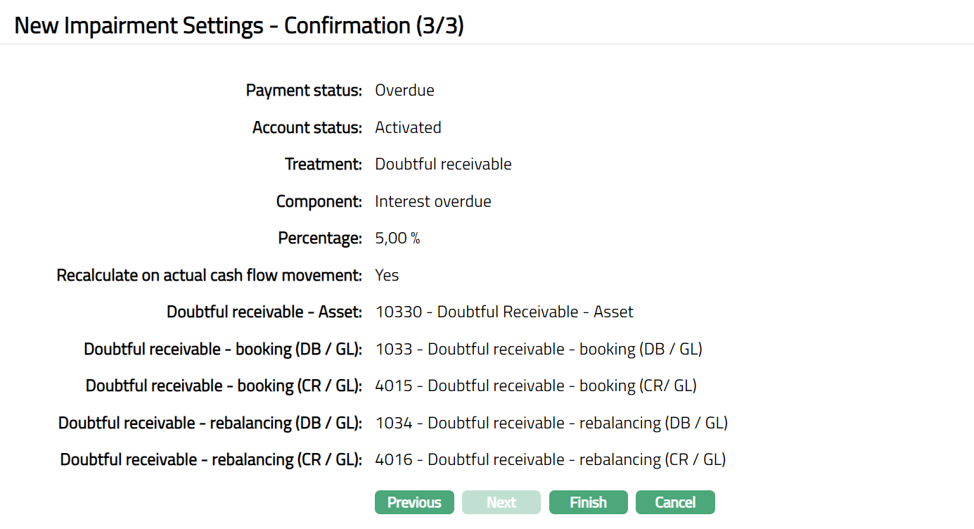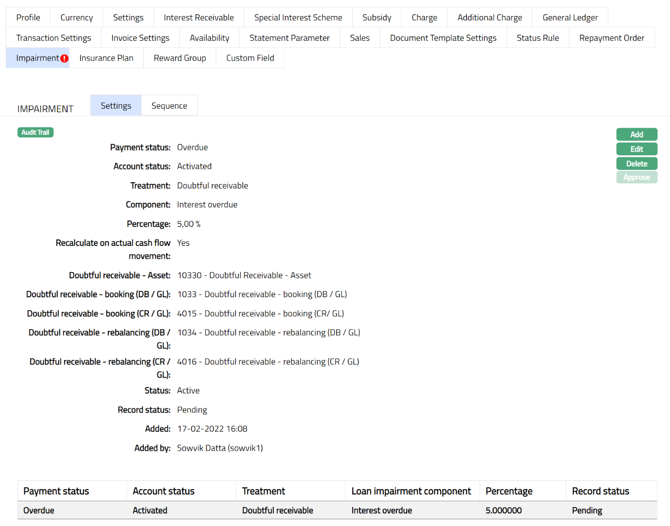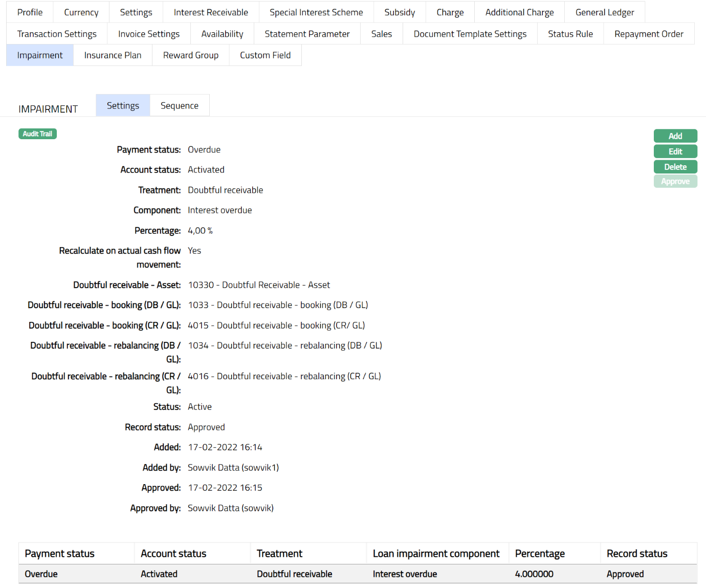 - Click Save. The Settings page under Impairment tab page appears with the edited details.