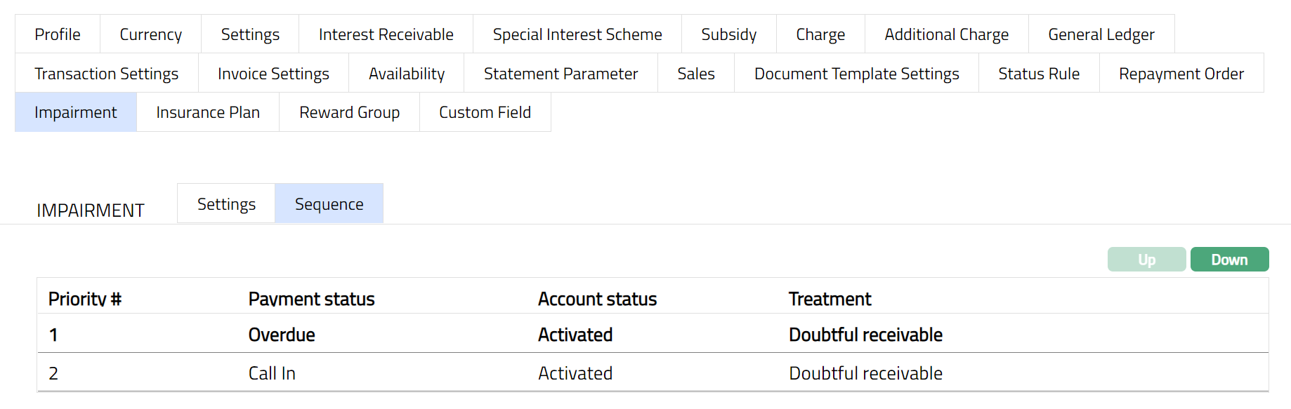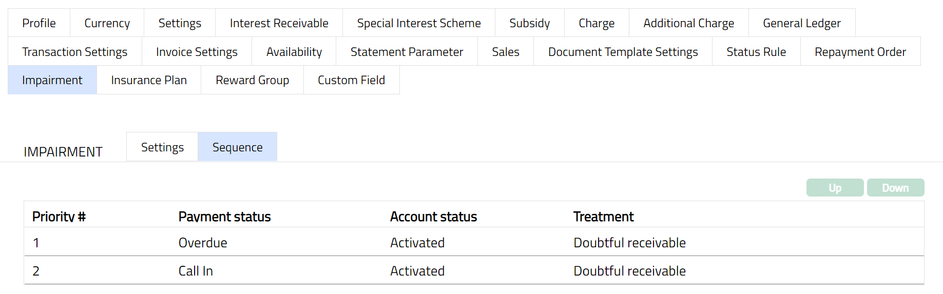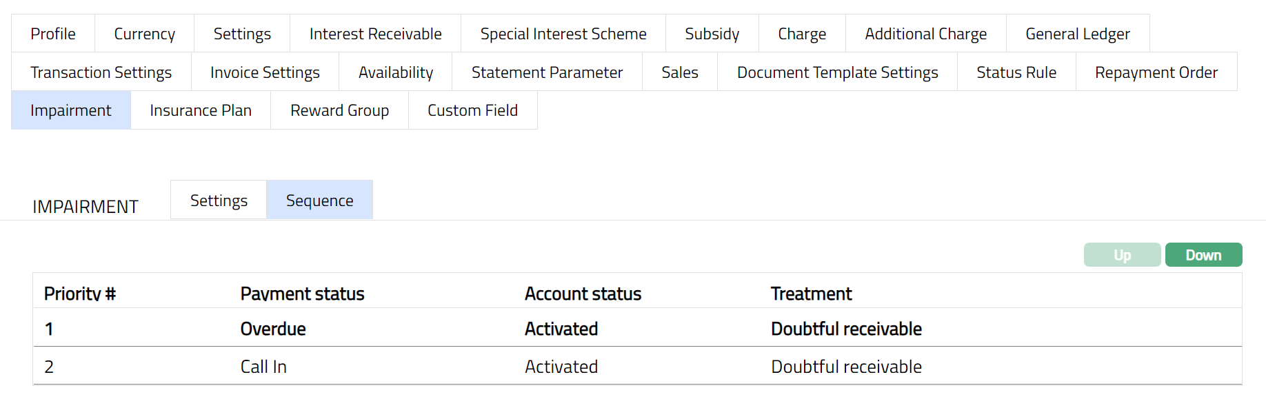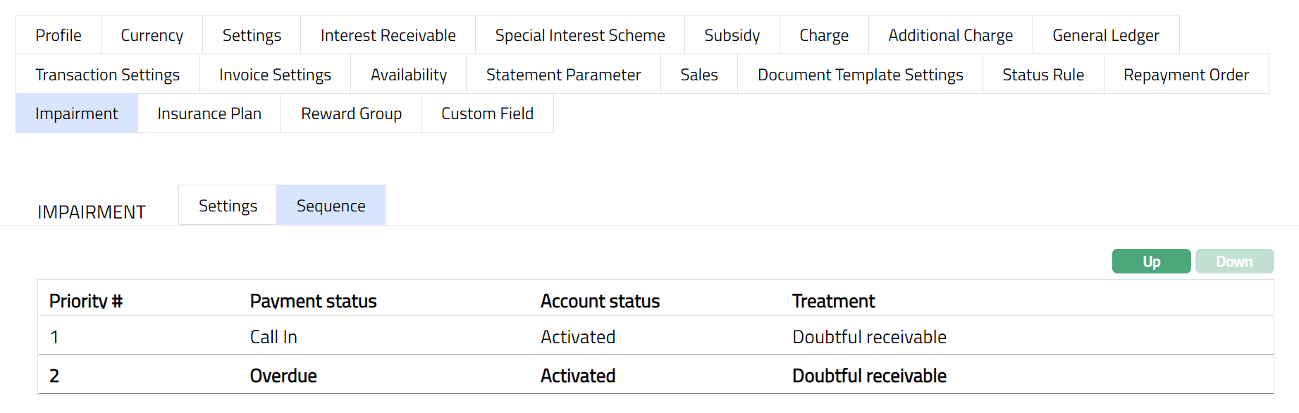 The data in this tab is populated as and when user approves new impairment treatment record in the Settings Tab, or when a record is deleted from the Settings Tab. You can change the sequence by moving the treatment's priority up and down