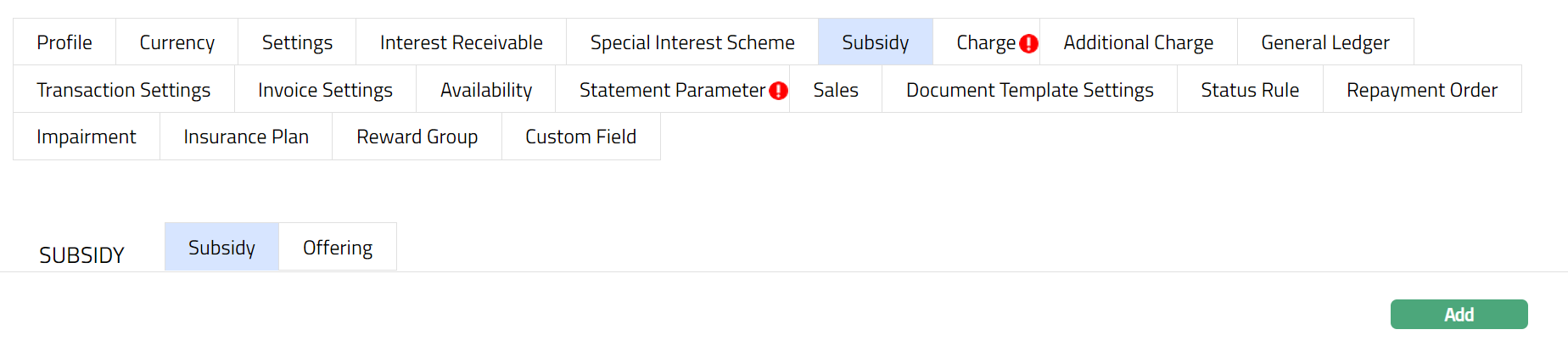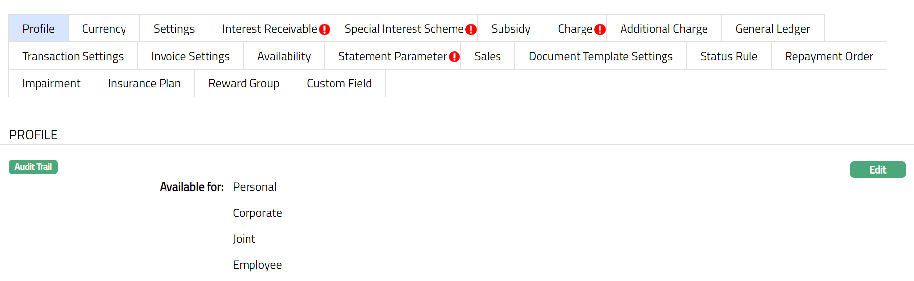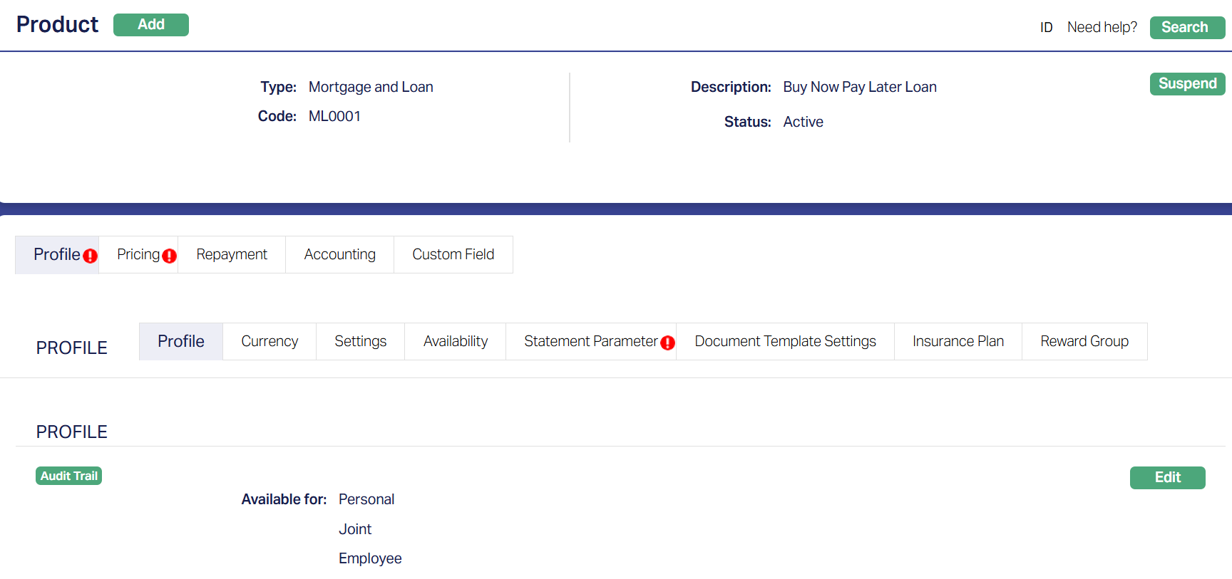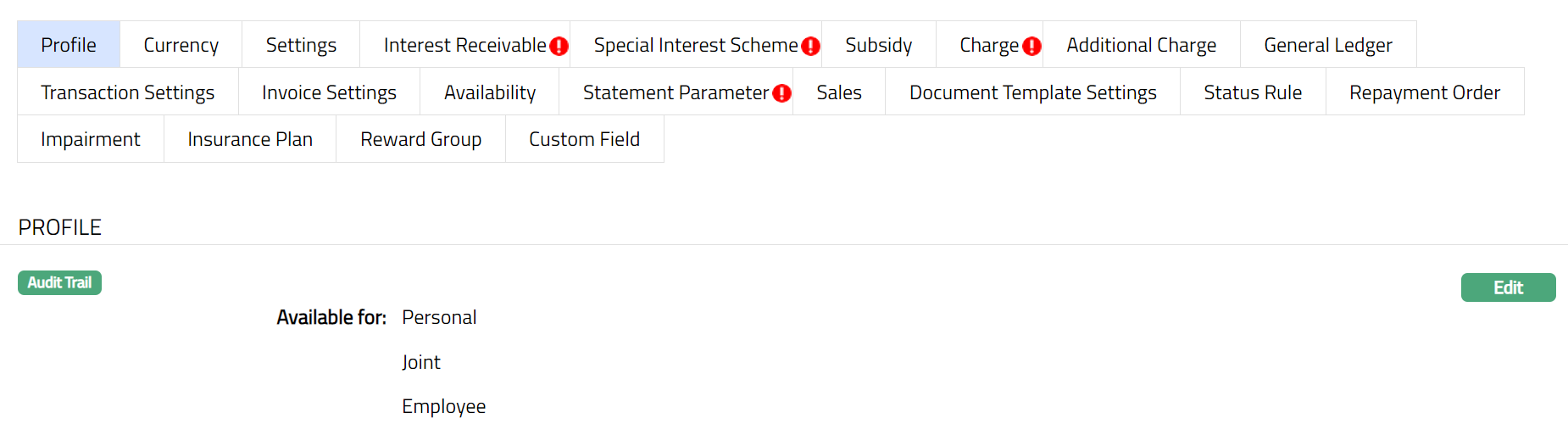 The following are the tabs in a Mortgage and Loan Product and are aggregated under these tab heads: