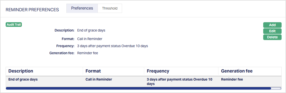 Payment Due On Date will be as follows for the different Holiday Preferences:Preference Payment Due On Date Ignore 26-Dec-2025 Next business day 29-Dec-2025 Previous business day 24-Dec-2025 Enter the holiday preference for grace days for penalty from the Holiday preference (Grace days for penalty) dropdown list. This field specifies the holiday treatment to be applied when the End of Grace Days happens to be a holiday. This field is disabled if Grace Days For Penalty is defined as Business Days. The late payment fee / penalty calculation will start based on this treatment, but with effect from the Due Date. The options available are: