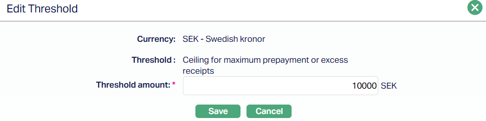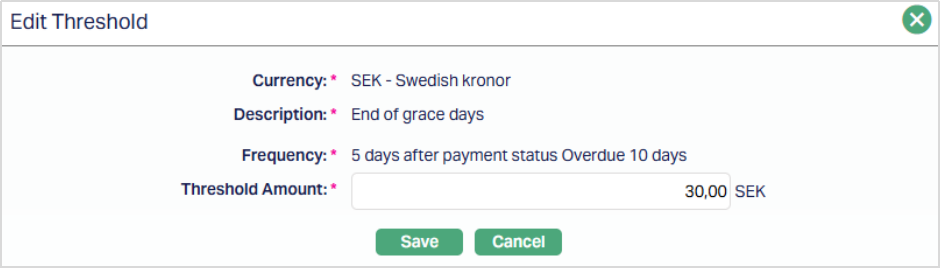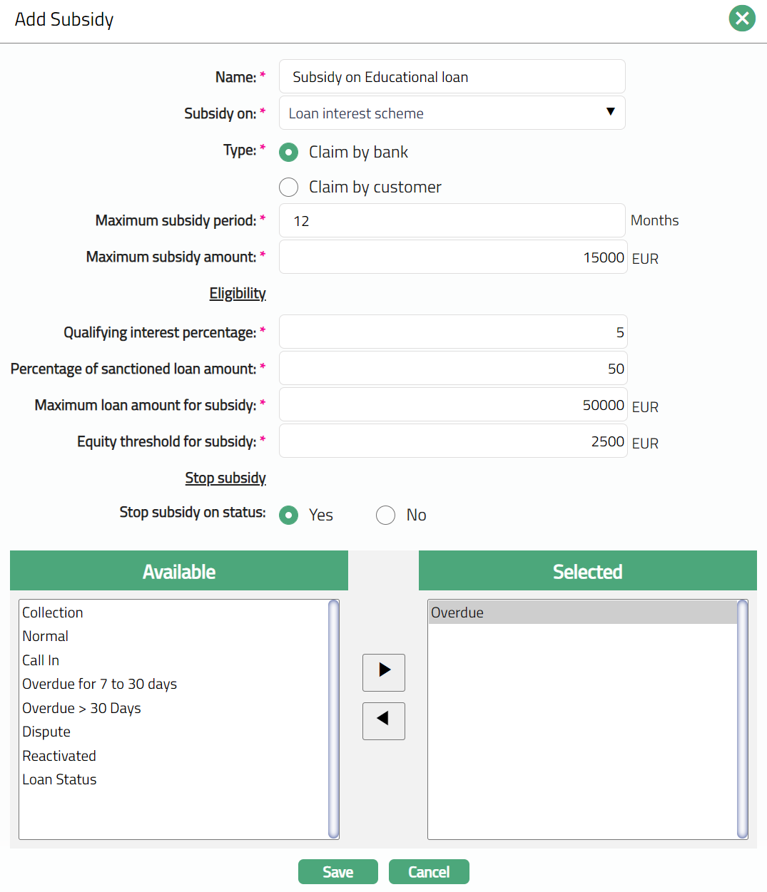 Enter the threshold amount for closure of a loan account in Threshold for closure field. At EOD, if the total receivable amount is less than threshold amount for closure, then Aura will pass threshold entries for the account and will close loan account.