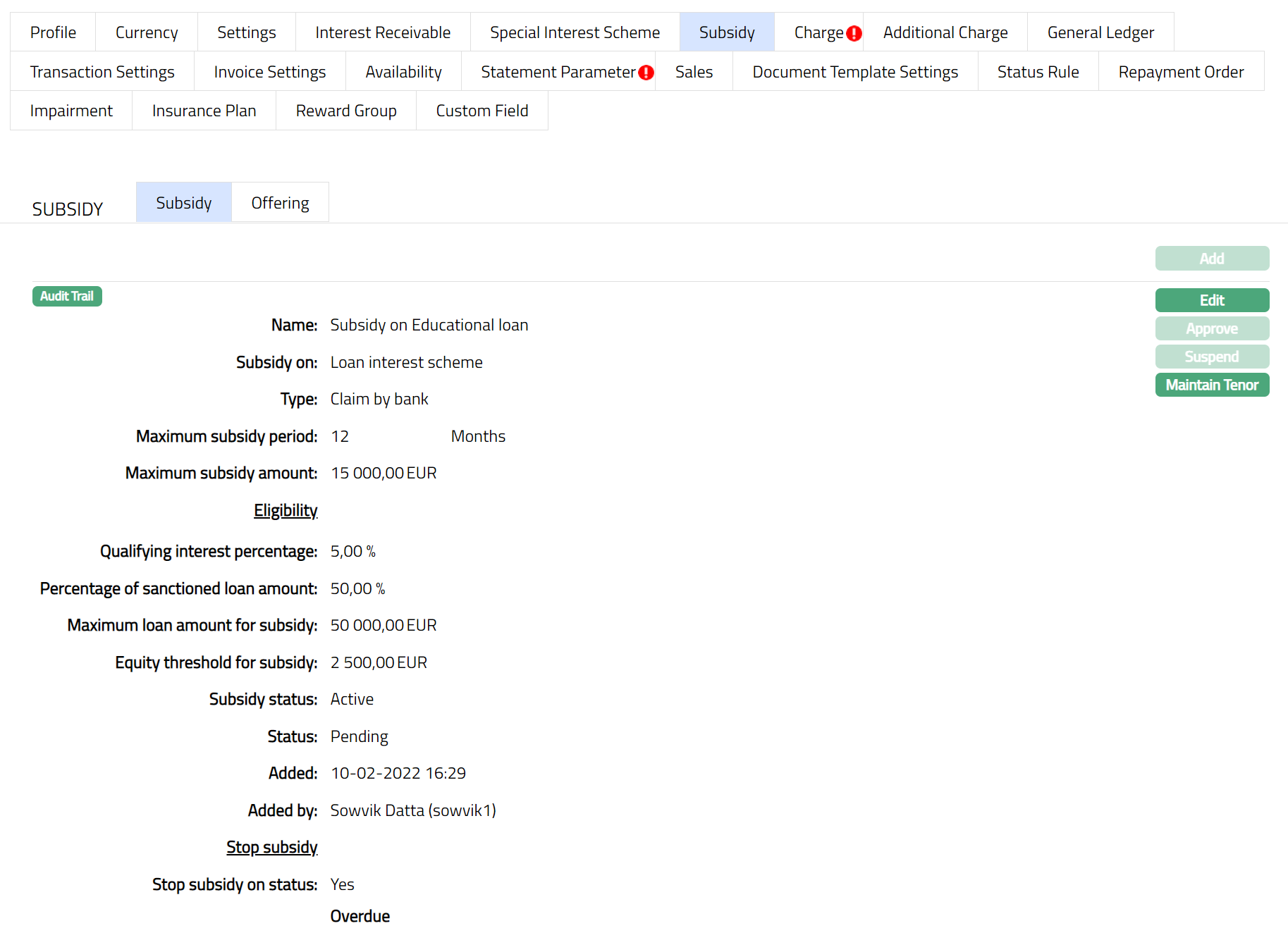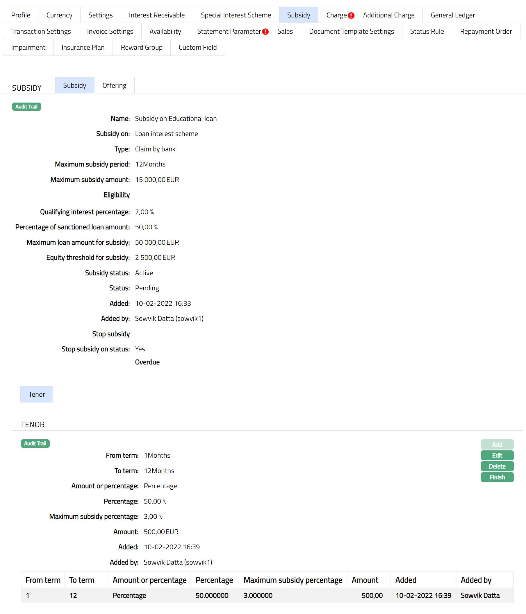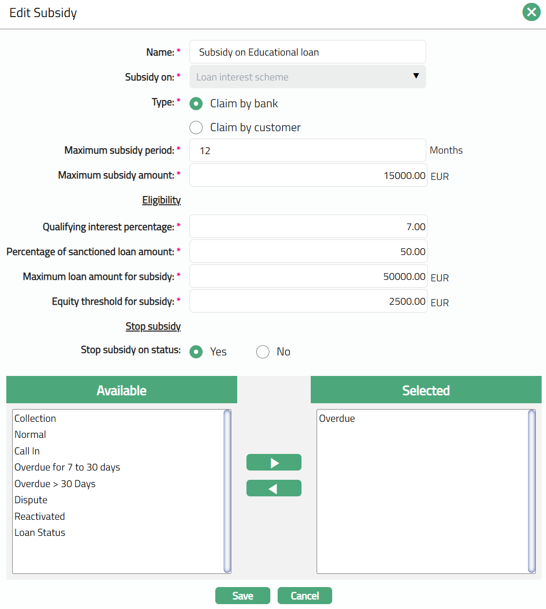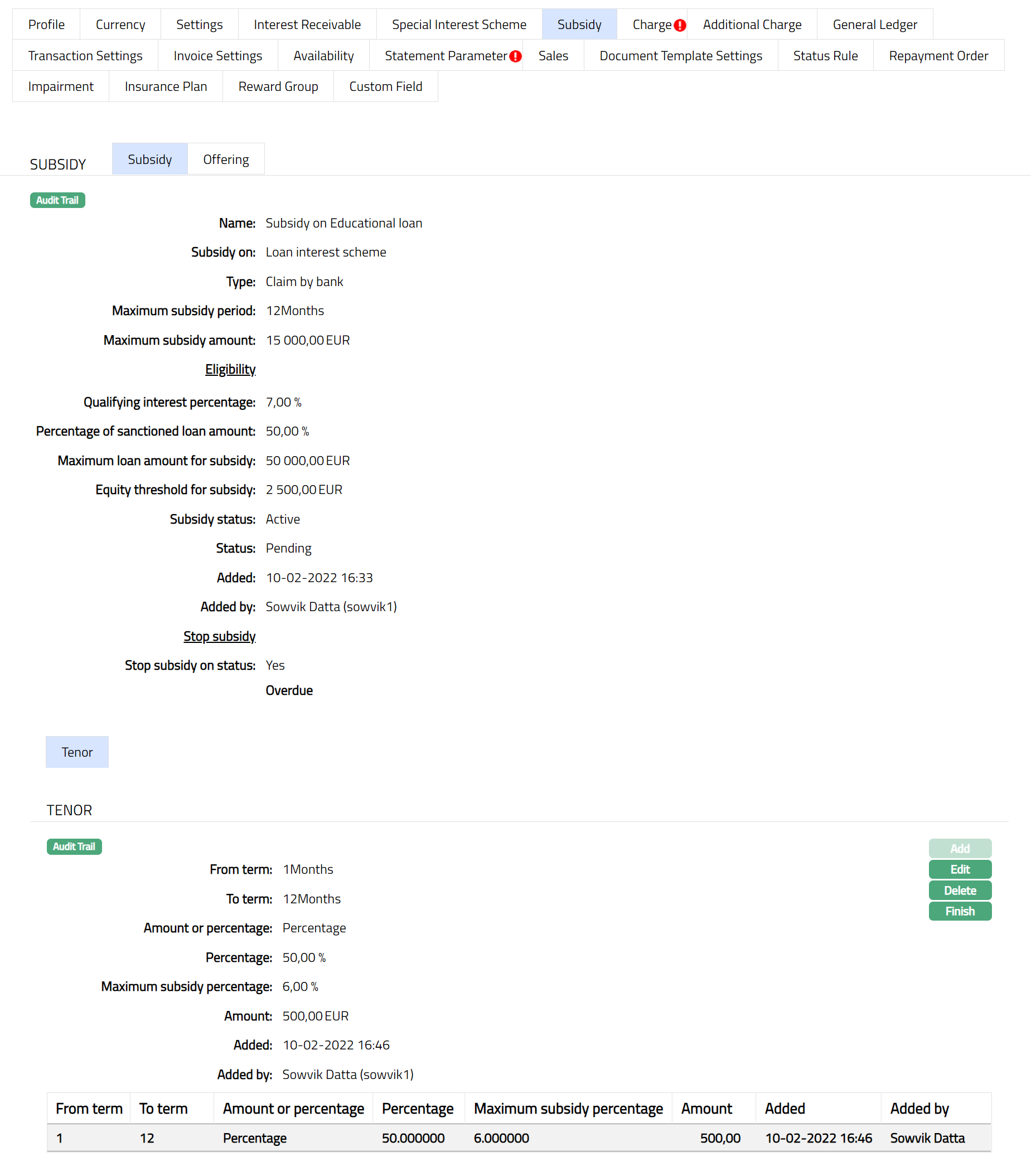 Loan Account can be activated only when the mapped collateral / limit amount >= EUR 75 000.00Enter the Minimum interest rate for the loan accounts under the Product.