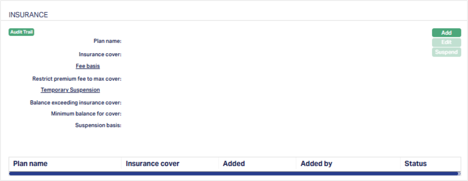 Suspend: You can suspend an Insurance Plan record by clicking on Suspend button. When you click on Suspend button, Aura will ask for confirmation. On confirmation Aura will suspend the Insurance Plan and Activate button will appear in place of the Suspend button. The status of the Insurance Plan is set to Suspended. Such suspended Insurance Plans will no longer be available for loan accounts created under the Product after such suspension.
