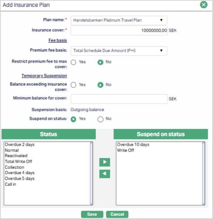 10. By default, Suspend on status will be selected as No and insurance plan will not be suspended when the loan moves to different Account Status or Payment Status. If Yes is selected, then Status pane with all the user defined statuses maintained at Admin > System codes > Generic definitions > Loan status definitions will be displayed. By selecting the loan statuses, you can define when the insurance plan needs to be suspended. When the loan account moves into any of the selected statuses, the insurance plan for the account will be suspended automatically; and will be automatically reactivated when the loan account status is moved to any Status that is not added to Suspend on Status pane.