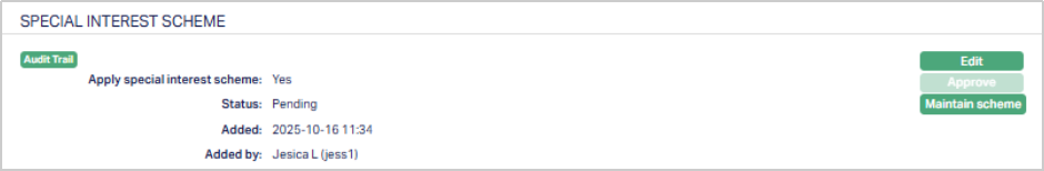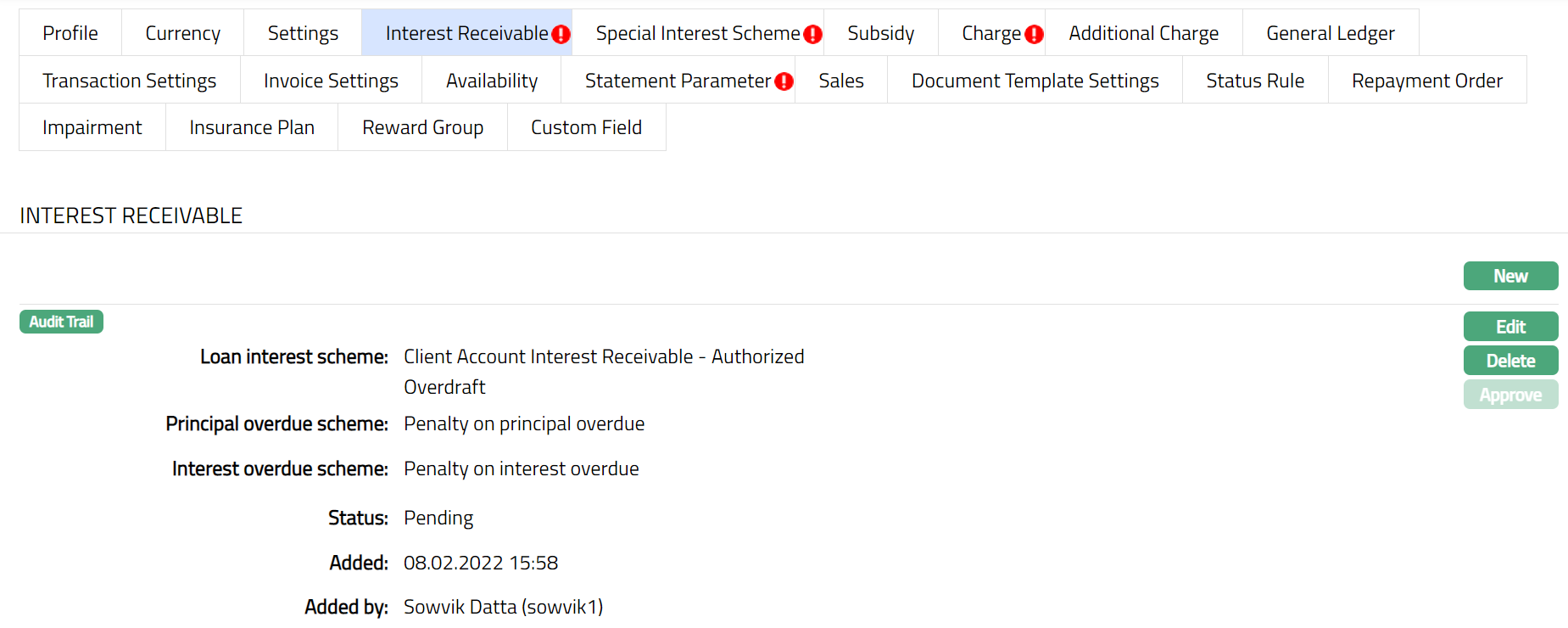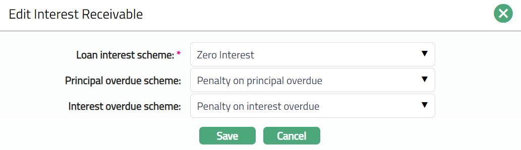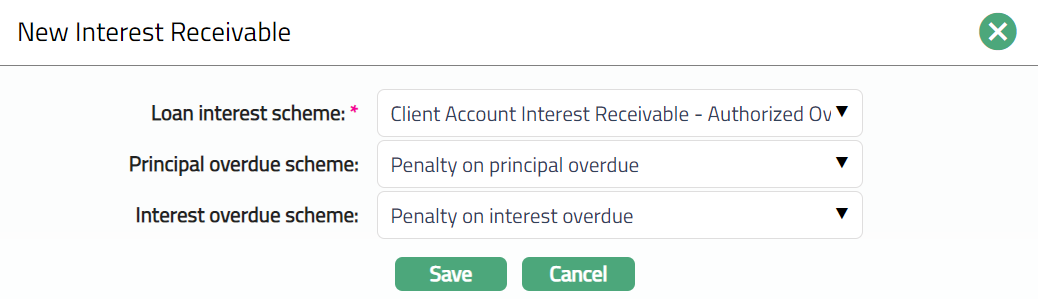 Select the Interest overdue scheme from the drop down. Interest schemes should have been maintained under Admin > Pricing > Interest > Interest Scheme. The penalty receivable on the Interest overdue (i.e., the Interest amount which was due but has not been received from the client even after the grace days) would be calculated using this scheme.
