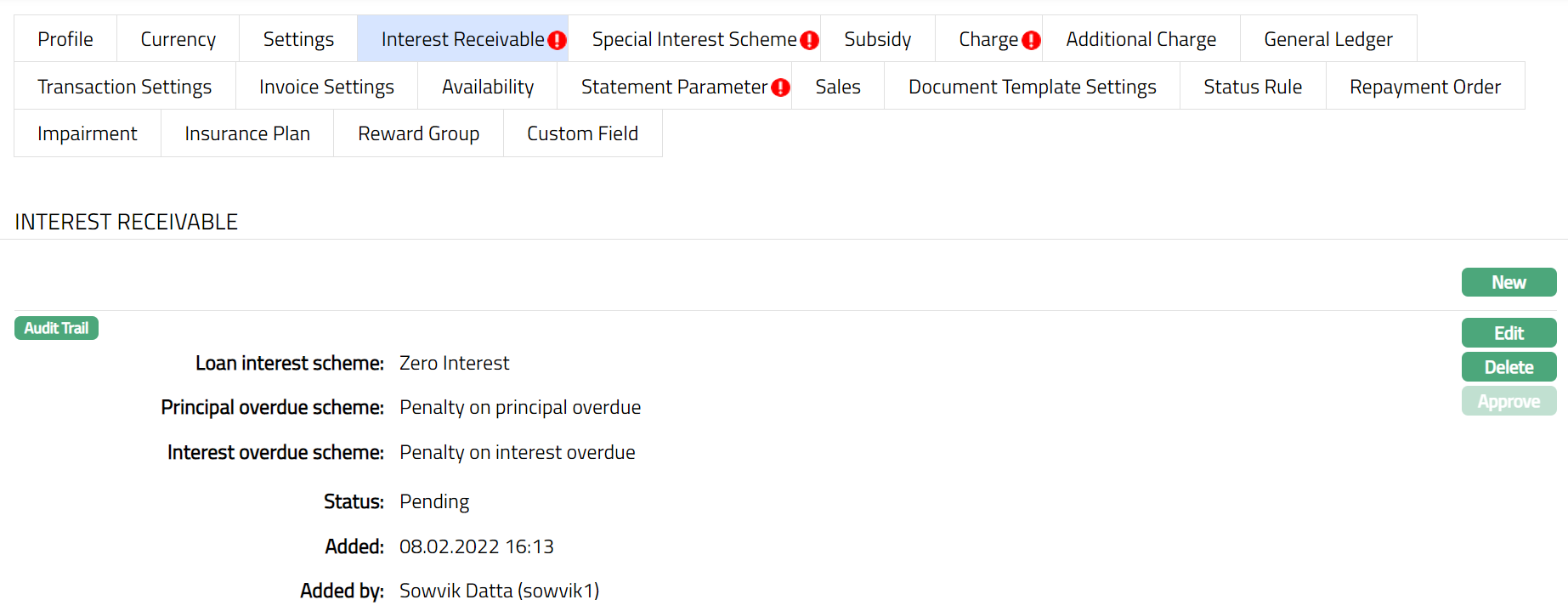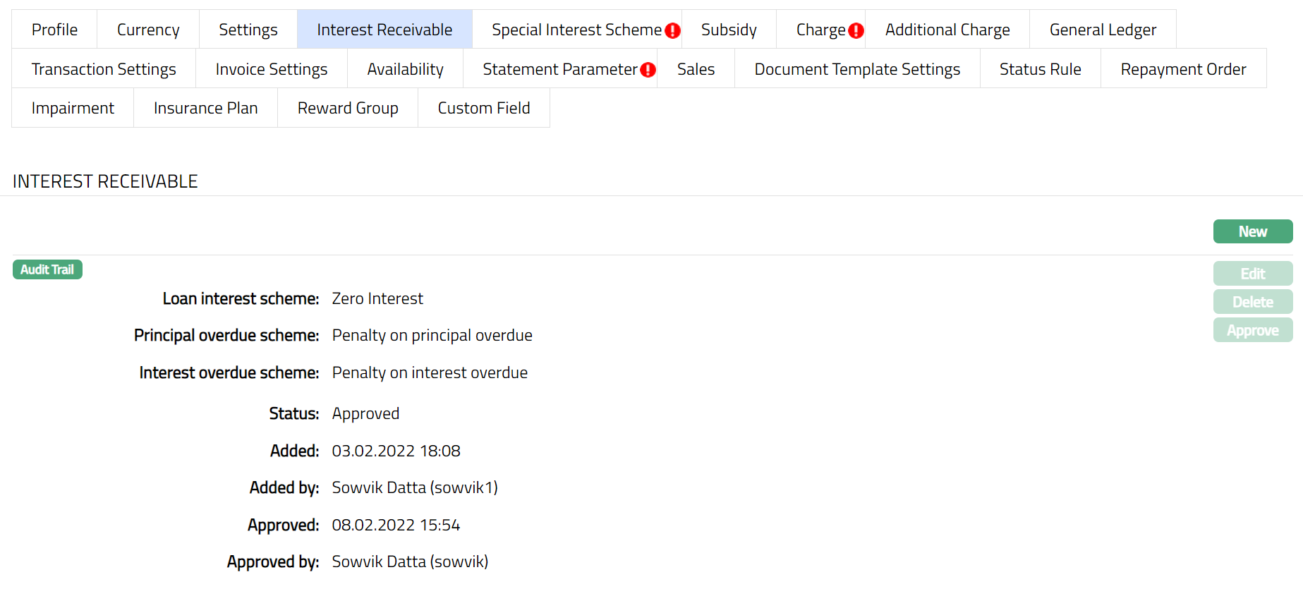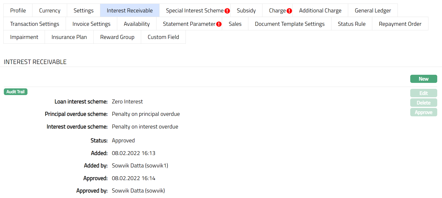 Select the Loan Interest scheme that would be applicable to the accounts under this Product from the drop-down list of Interest schemes maintained under Admin > Pricing > Interest > Interest Scheme. The interest receivable on the principal amount would be derived using this scheme.