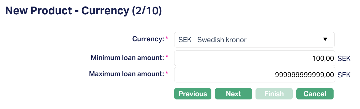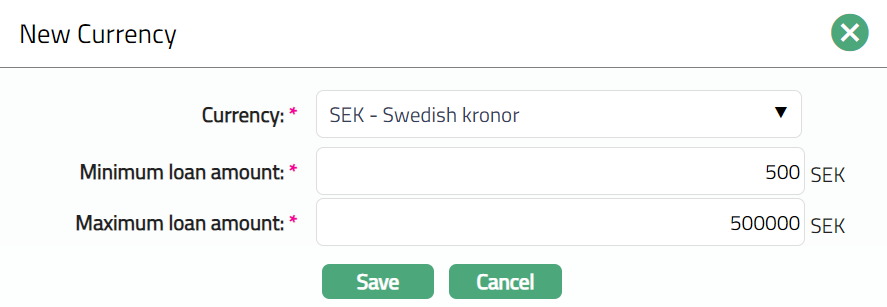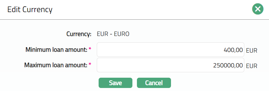 Enter the Maximum loan amount for the loan accounts under the Product for the above currency. The Maximum Loan Amount should be greater than the Minimum Loan Amount.
