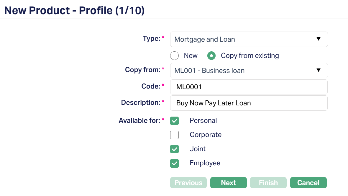 If you want to create a loan Product based on the properties of an existing loan Product, then select Copy from existing.