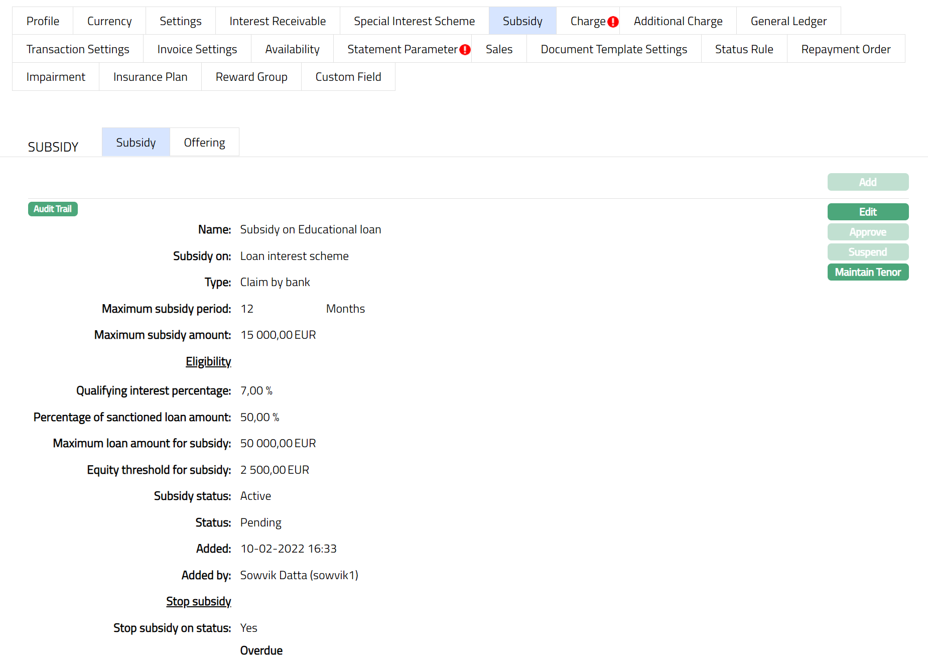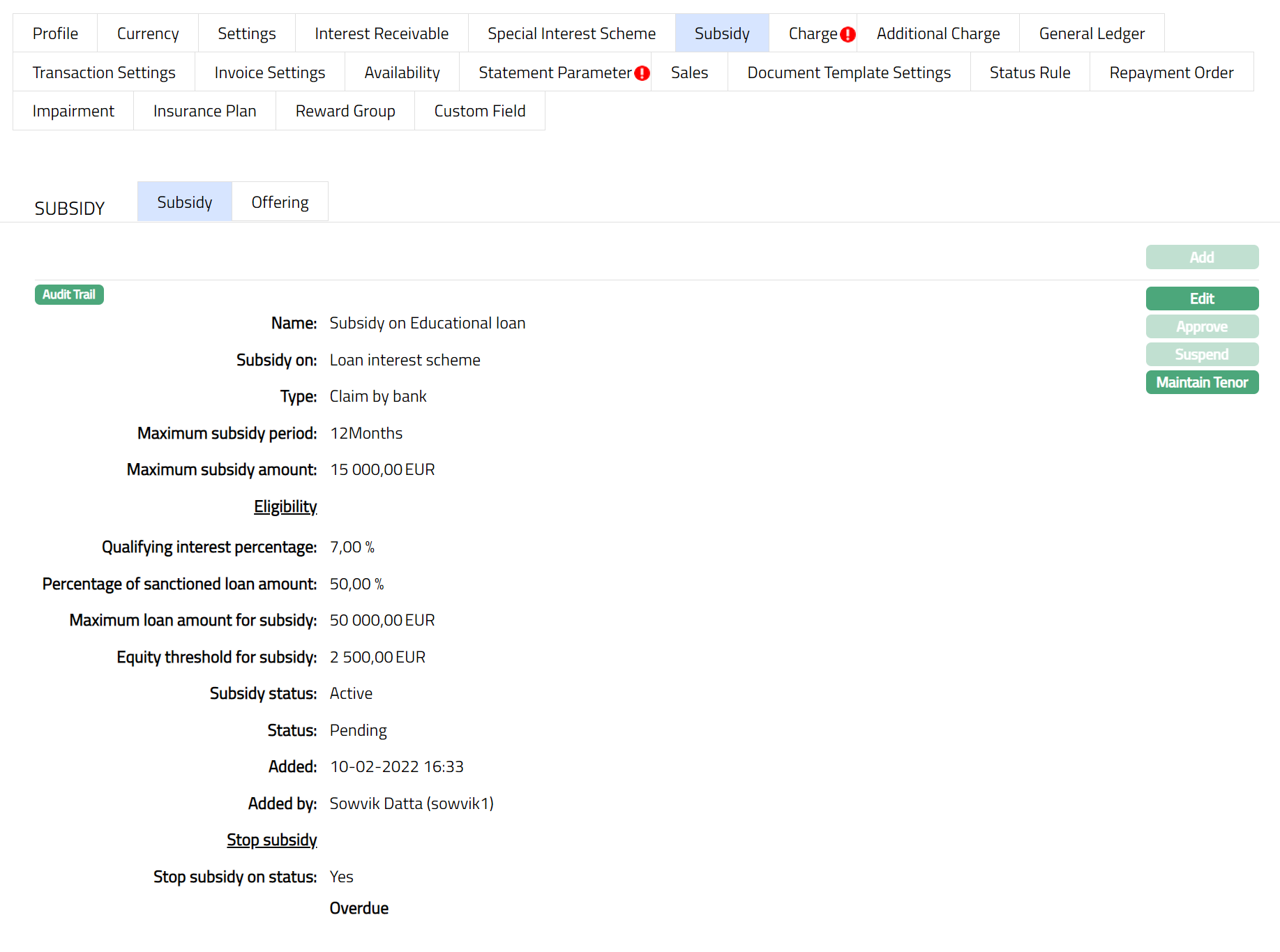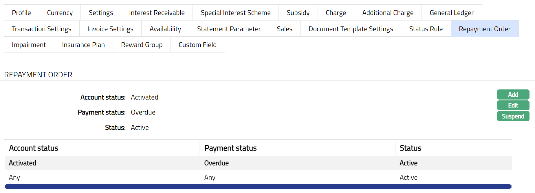 Activate: If you want to activate a suspended Insurance Plan record then click on Activate button. Aura will ask for confirmation. On confirmation Aura will activate the Insurance Plan and Suspend button will appear in place of Activate button. The status of the Insurance Plan is set to Active. Only such Active Insurance Plans will be available for loans created under the Product.