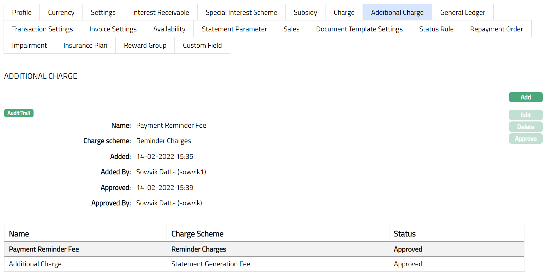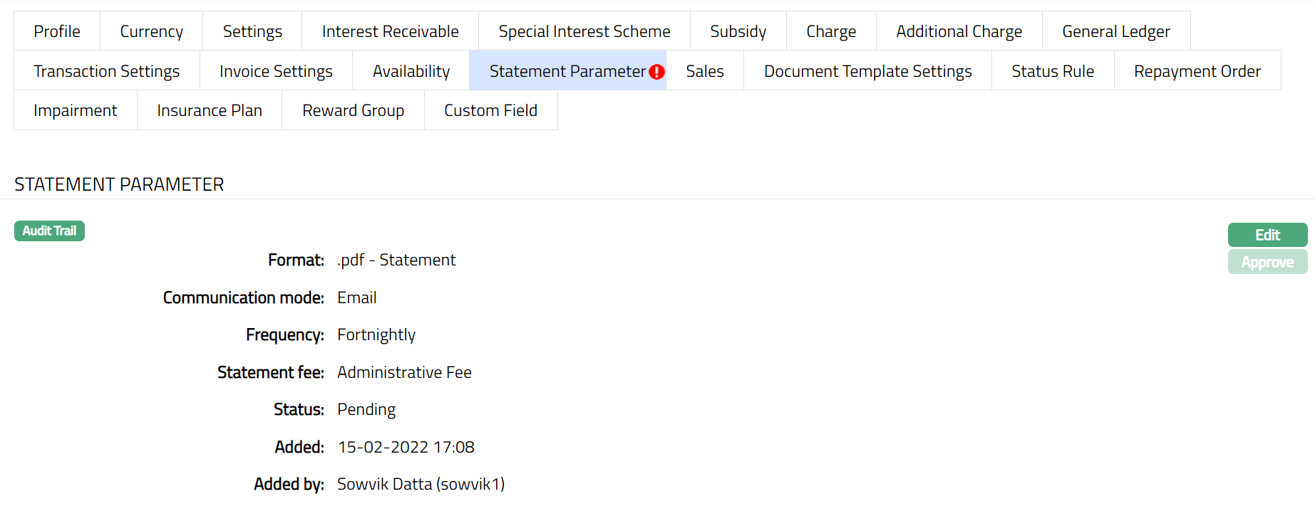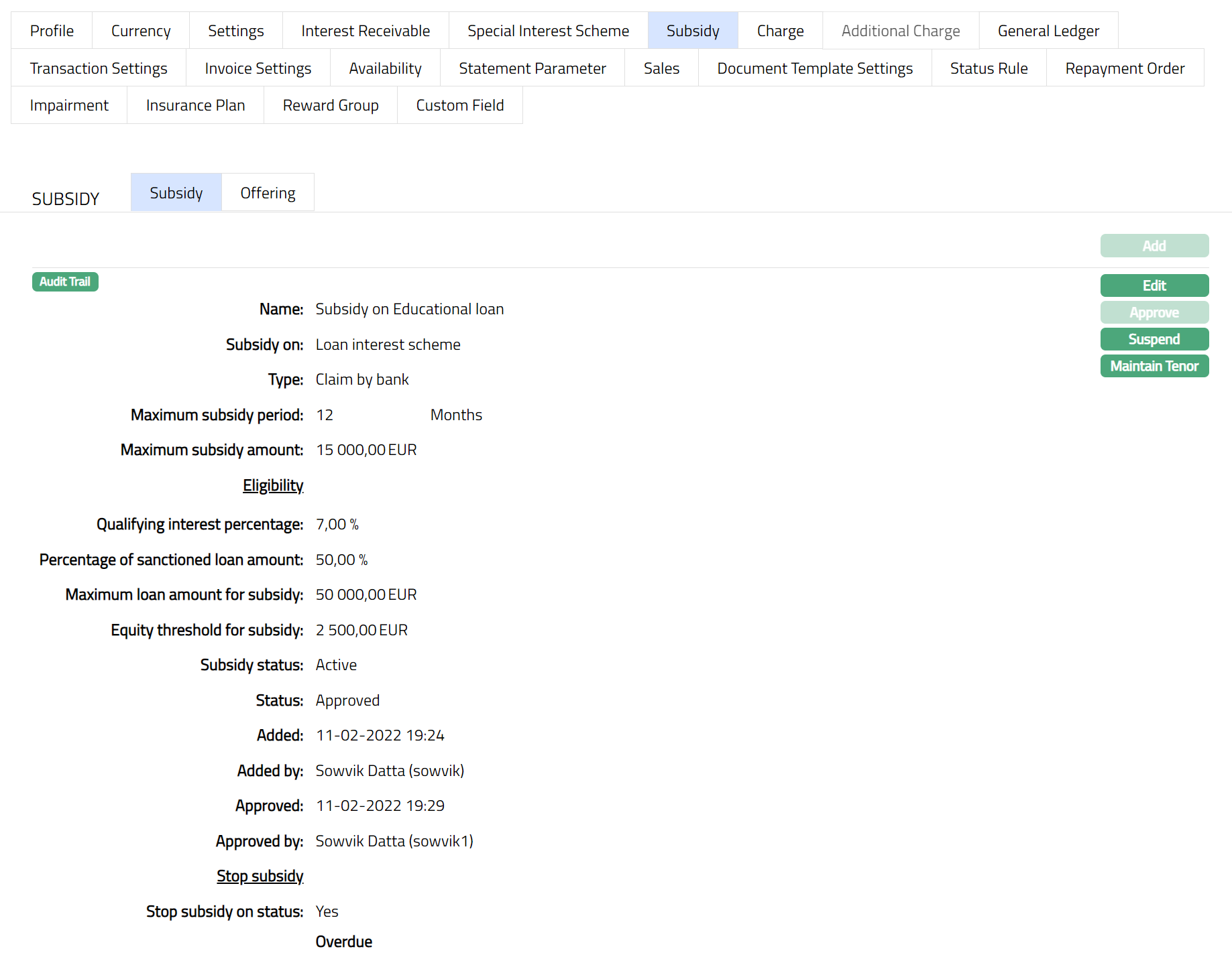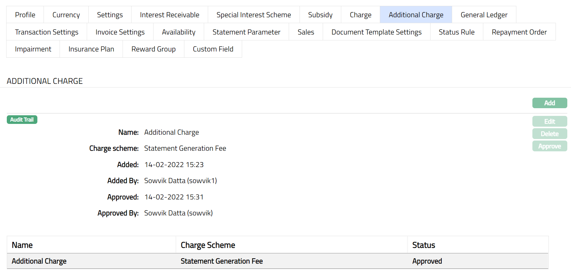 Activate: If you want to activate a suspended Insurance Plan record then click on Activate button. Aura will ask for confirmation. On confirmation Aura will activate the Insurance Plan and Suspend button will appear in place of Activate button. The status of the Insurance Plan is set to Active. Only such Active Insurance Plans will be available for loans created under the Product.
