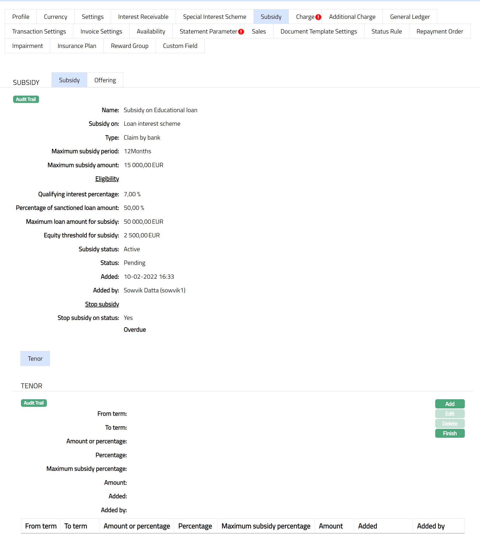 If Annuity is selected as your Interest Calculation Method, then On prepayment field will be available. You can choose to Revise Annuity or Revise Tenor. If you select Revise Annuity, and if there are any changes to the terms of the loan contract, the Tenor of the loan remains the same and the Annuity is appropriately recalculated. On the other hand, if Revise Tenor is selected, then, during change of terms, the Annuity of the loan contract remains the same and the tenor of the loan is suitably adjusted.