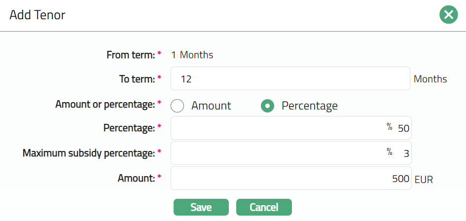 By default, the Generate Schedules for Full Tenor checkbox is unchecked, and the schedules will be generated for only 12 schedules. When this checkbox is checked, the schedules will be generated for the entire loan tenor.