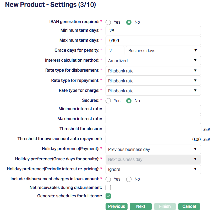 The Interest Reset Date will be as follows for the different Holiday Preferences:Preference Interest Reset Date Ignore 26-Dec-2025 Next business day 29-Dec-2025 Previous business day 24-Dec-2025 Include Disbursement Charges in Loan Amount can be used to indicate if the Loan Amount should be enhanced by the initial disbursement related charges. When this is set to Yes, the Sanctioned Amount of any loan account that is created under this Product would automatically be increased by the amount of charges that is applied at the time of the first disbursement. When this is set to No, there is no such increase in the loan's Sanctioned Amount.