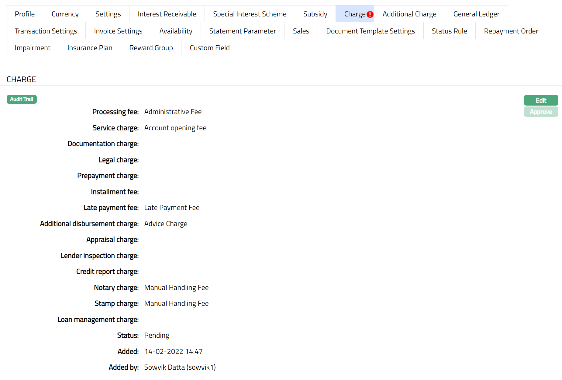 Disbursement Charges: The following charges defined in the Loan Account → Default Charges Tab along with any Adhoc Charges applied on the account before the first disbursement will be considered as Disbursement Charges: