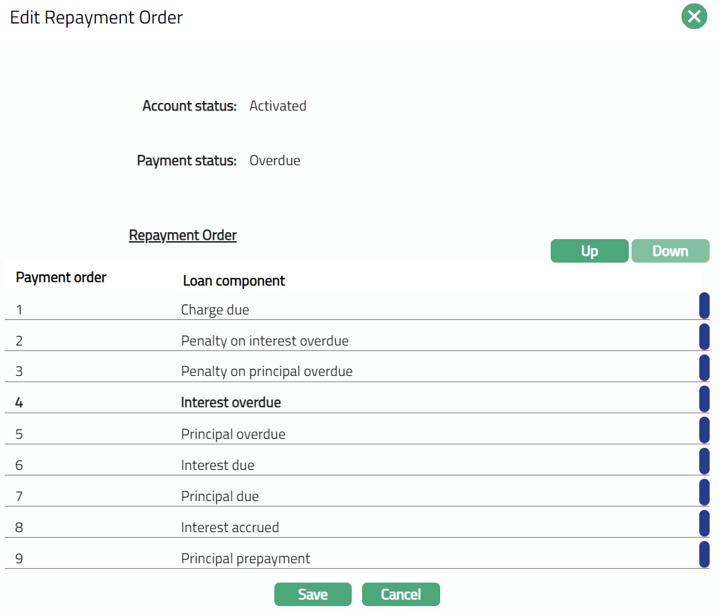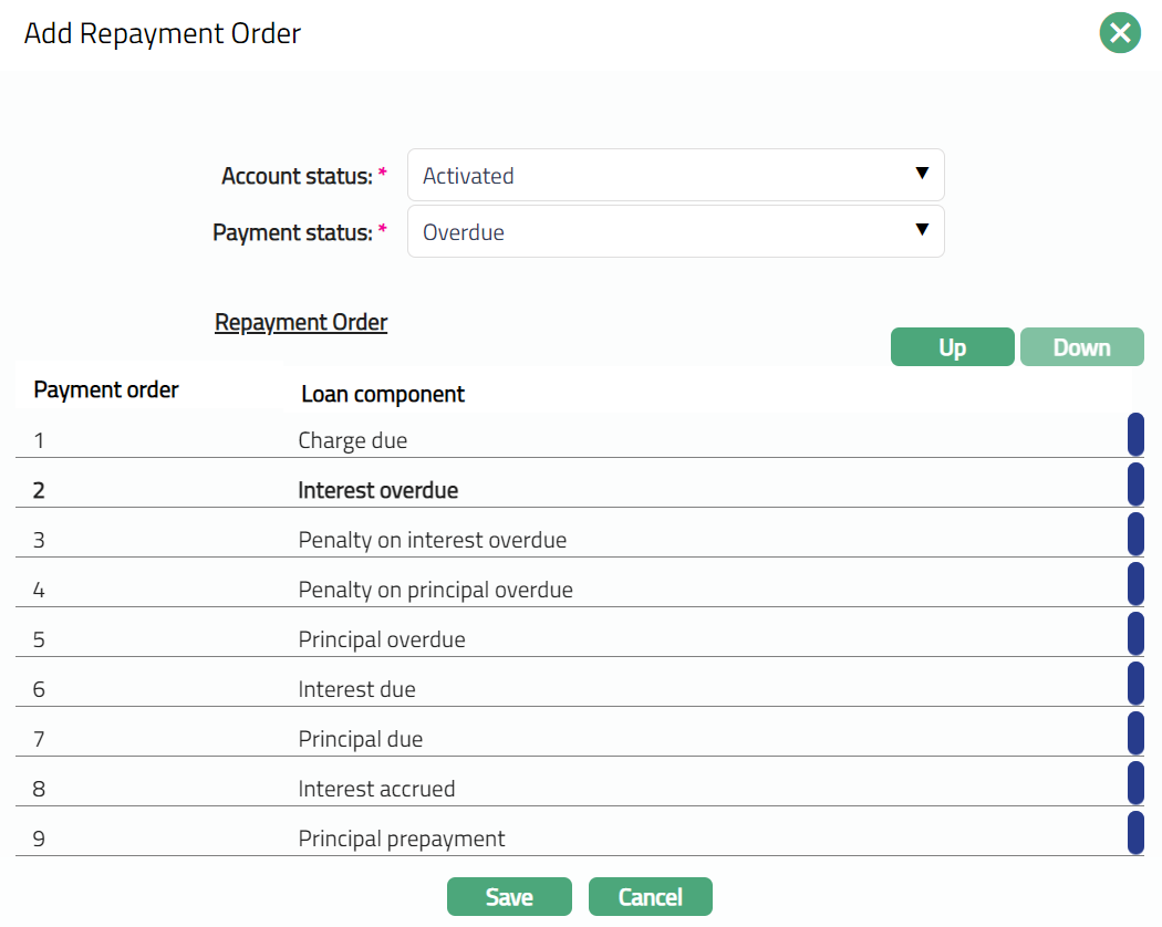 If you want to change the order, select the required impairment treatment record which enables the Up and Down buttons.