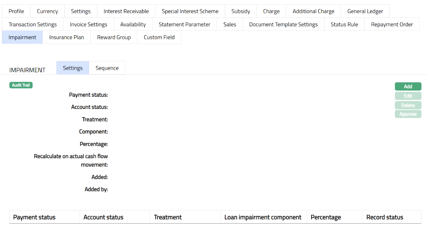 Go to Product page, click on Impairment tab. By default, Settings tab will be opened.