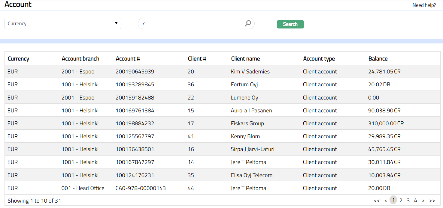 - From Retail menu, click Transaction review and then Account statement. Account page appears. From search page you can search for Account Statement from the available drop-down options of Account #, Account branch, Client # or Currency. Below is the Account Statement with Currency option.