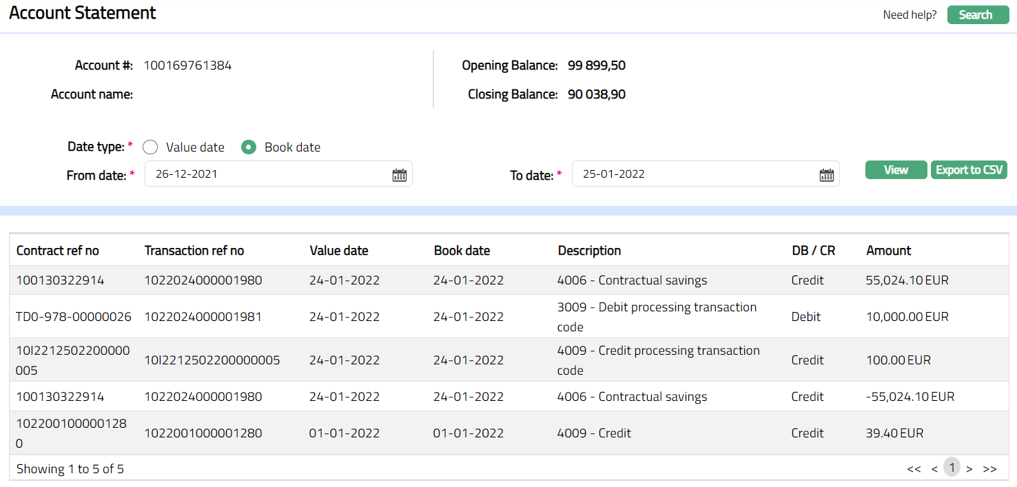 If you have made changes to the above fields, click View to view the list of transactions that were posted between From date and To date for the selected account.