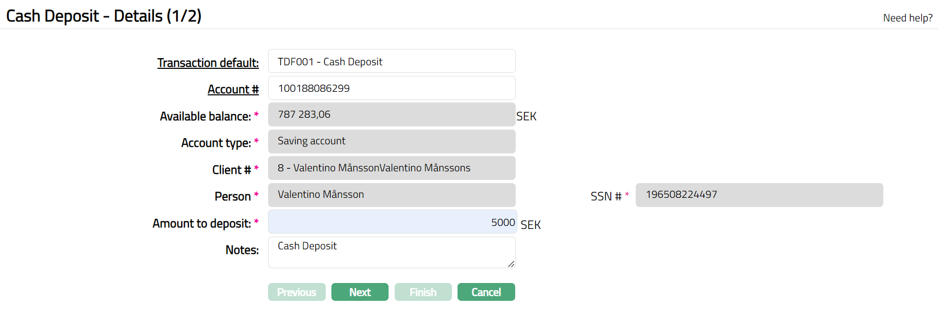 - From Retail menu, click Transaction Wizard and then Cash Deposit. Cash Deposit - Details (1/2) appears.